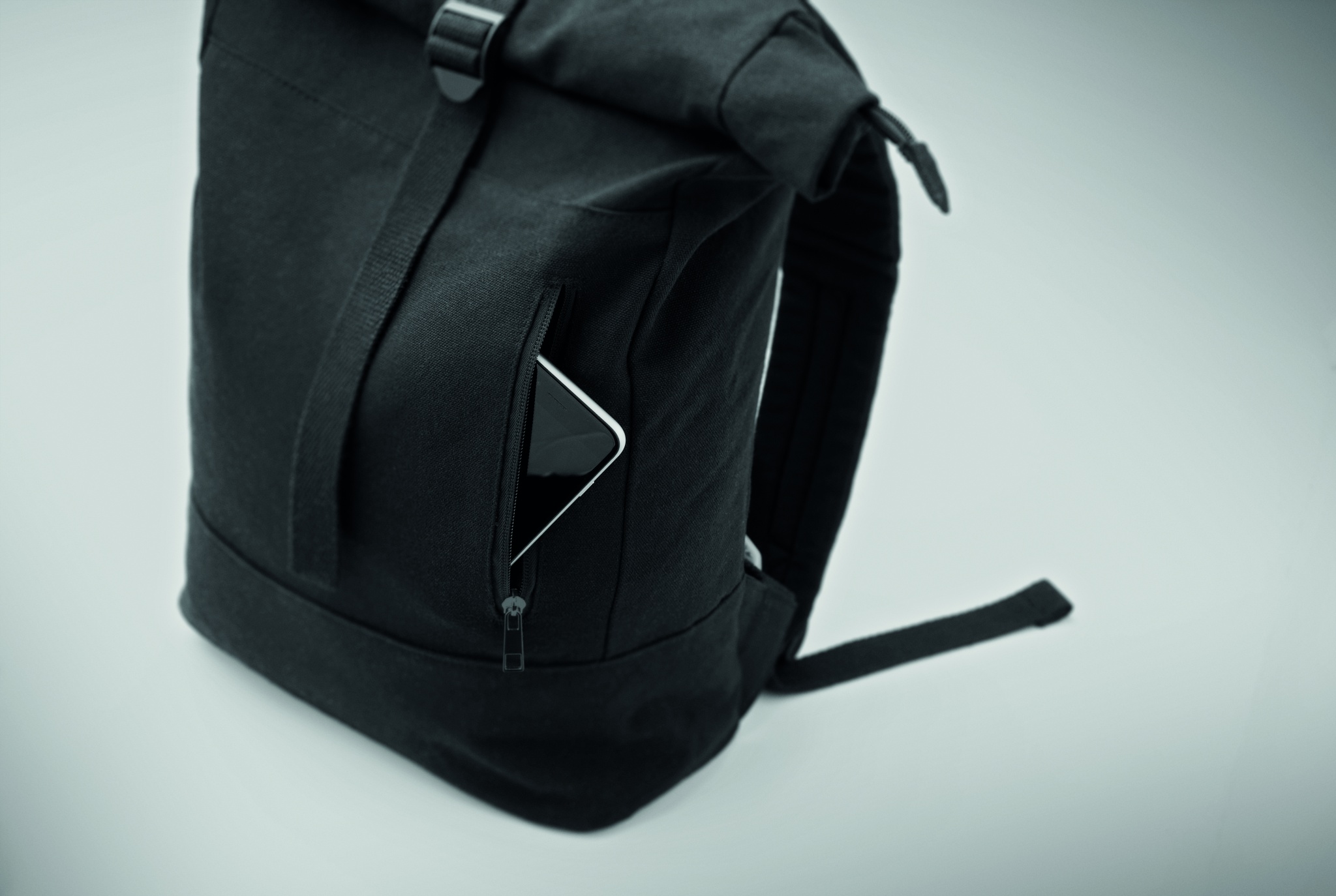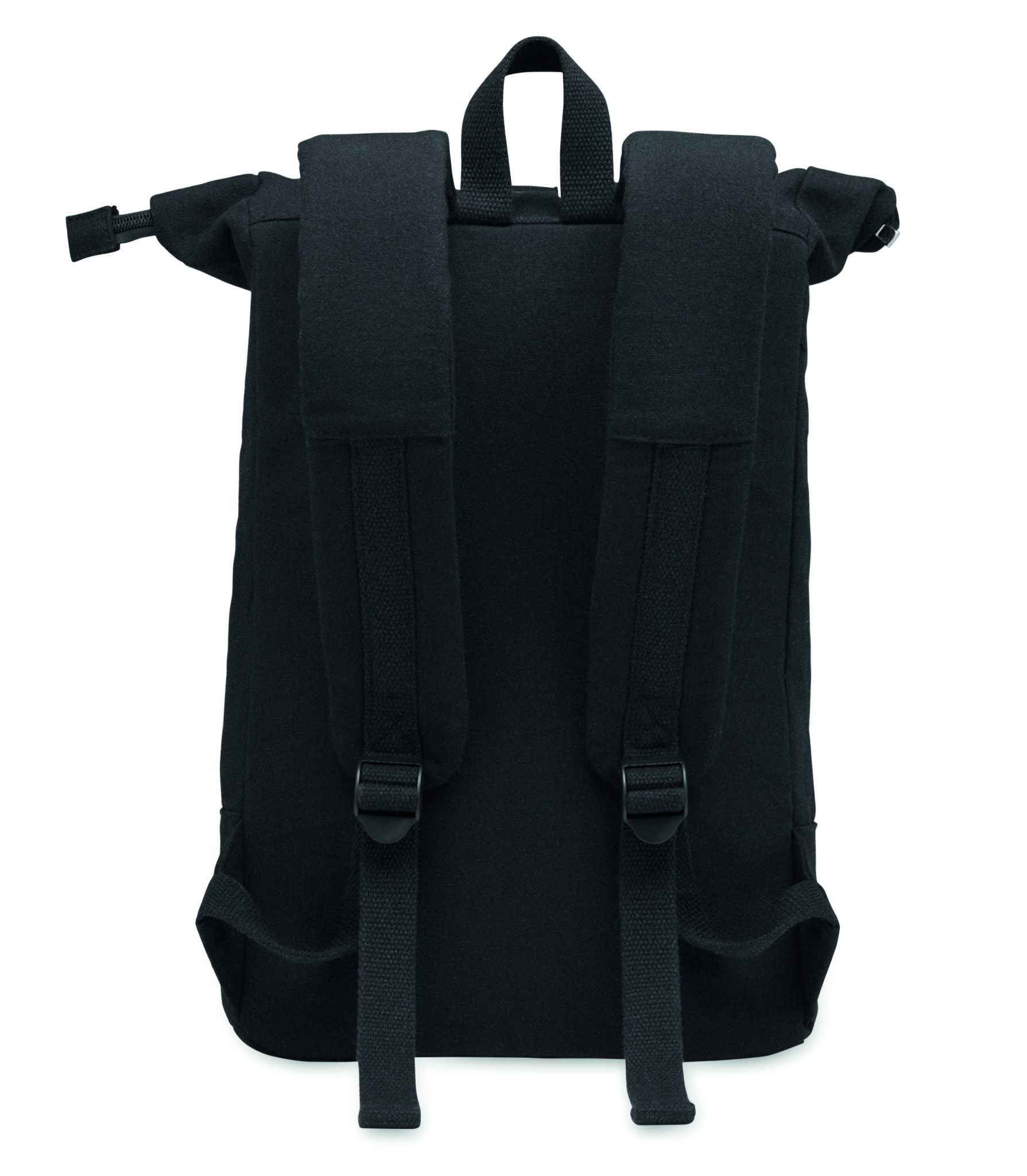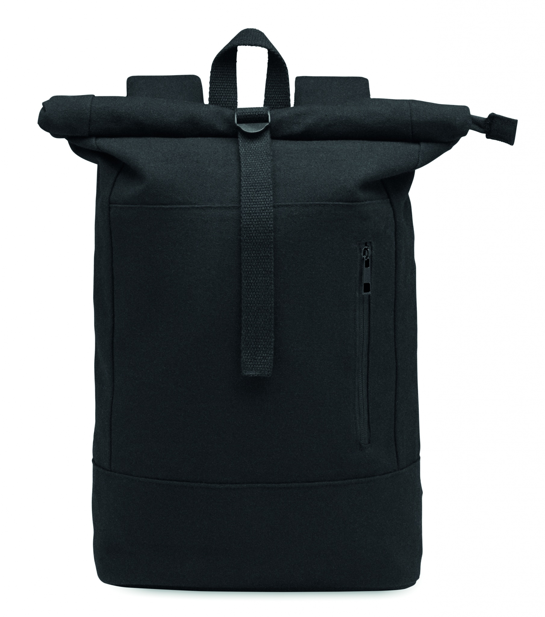 15'''' Rolltop-Laptop-Rucksack mit Reißverschluss aus recycelter Pre-Consumer-Baumwolle (70%) und recyceltem Polyester (30%). Fronttasche mit Reißverschluss. Gepolsterter Rücken und Schultergurte. 340g/m².