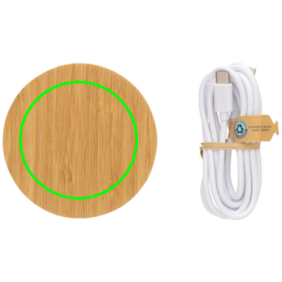 Ultraschnelles kabelloses 15W-Ladegerät mit 100% FSC®- Bambus-Gehäuse. Kabelloses Laden ist kompatibel mit Android der neuesten Generation, iPhone 8 und höher. Artikel und Zubehör PVC-frei. Inklusive 150cm Type-C Ladekabel aus RCS-zertifiziertem Recycling-TPE. Verpackt in FSC®-Mix-Kraftkarton. Type-C Input: 5V/2A; 9V/2A;12V/1,5A; Wireless Output: 5V/1A;9V/1,1A; 9 V/1,67 A (15 W)