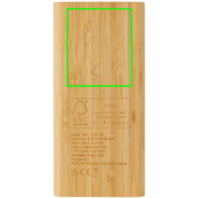 8.000mAh Powerbank mit Gehäuse aus 100% FSC®-zertifiziertem Bambus. Die Powerbank enthält einen langlebigen Lithium-Polymer-Akku der Klasse A mit 8.000 mAh. Die Powerbank unterstützt sowohl Laden per Kabel als auch kabelloses Laden mit 5W. Die Ladestandsanzeigen zeigen die verbleibende Energie an, sodass Sie immer wissen, wann Sie wieder aufladen müssen. Kabelloses Laden, kompatibel mit Android der neuesten Generation, iPhone 8 und höher. Input Mikro und Type-C, DC5V/2A; Output USB-A, Micro-USB und Type-C DC5V/2A; Wireless Output: 5V/1A. Inklusive PVC-freiem Ladekabel aus recyceltem TPE-Material. Artikel und Zubehör 100% PVC-frei. Verpackt in FSC®-Mix-Verpackung.