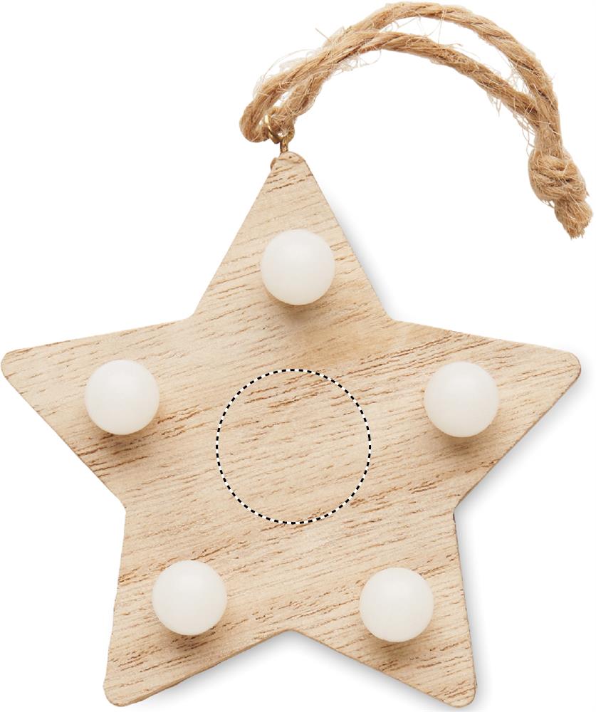 Anhänger aus Holz in Form eines Sterns (80% Pappel und 20% Weide). Verziert mit 5 LED-Lichtern und Aufhänger aus Kordel. Inkl. 1 CR2032-Batterie. Holz ist ein natürliches Produkt, es kann daher zu leichten Abweichungen in Farbe, Dekor und Maßen kommen.