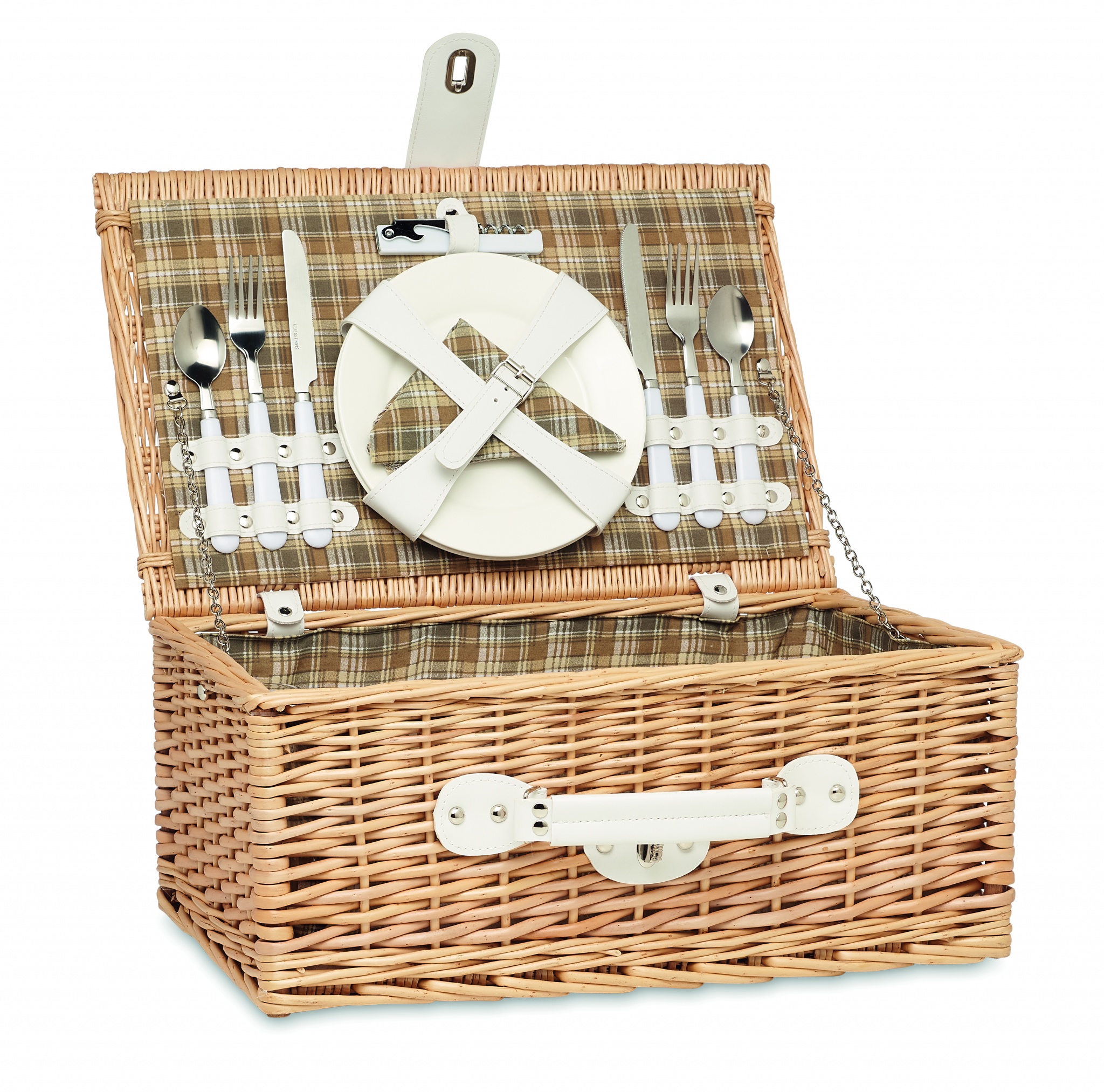 Picknickkorbset für 2 Personen aus Weidengeflecht mit je 2 Messern, Gabeln, Löffeln aus Edelstahl, Keramiktellern, Gläsern, Polycotton-Servietten sowie einem Kellnermesser.