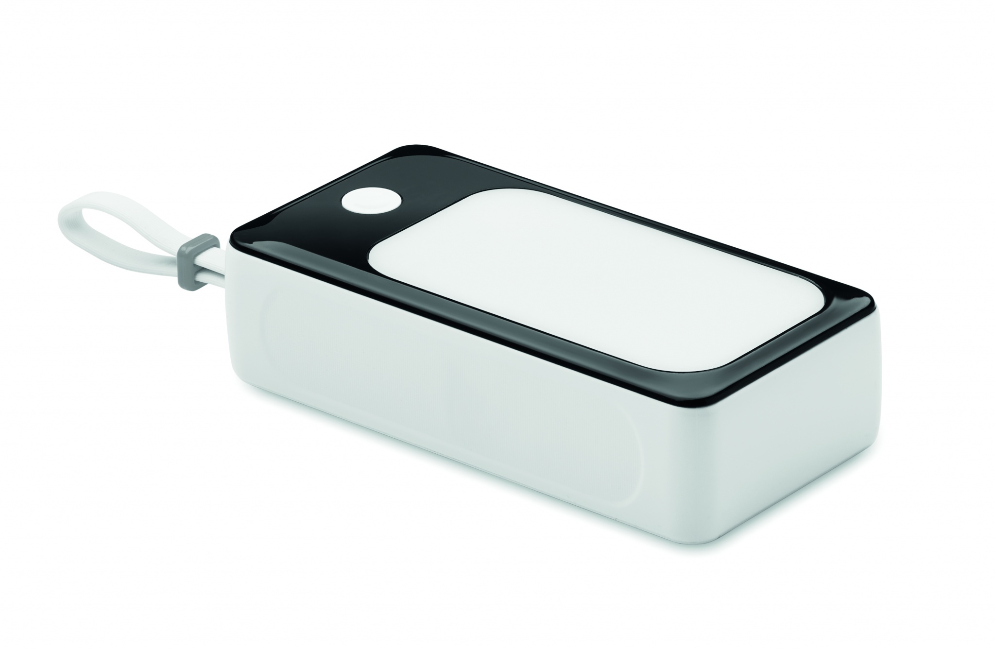 Power bank 10000 mAh capacity in abs casing. Output current DC5V/2A 1x type A and 1x type C in/out. Includes indicating 4 light setting (9 COB led) and integrated USB cable with Type C plug output. PD 22,5W support with battery display.