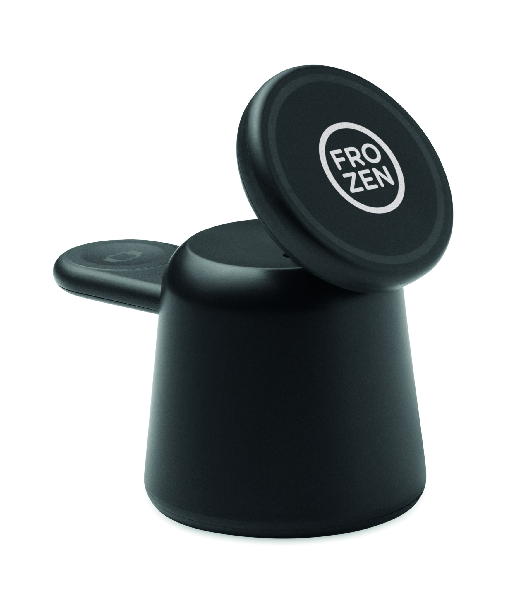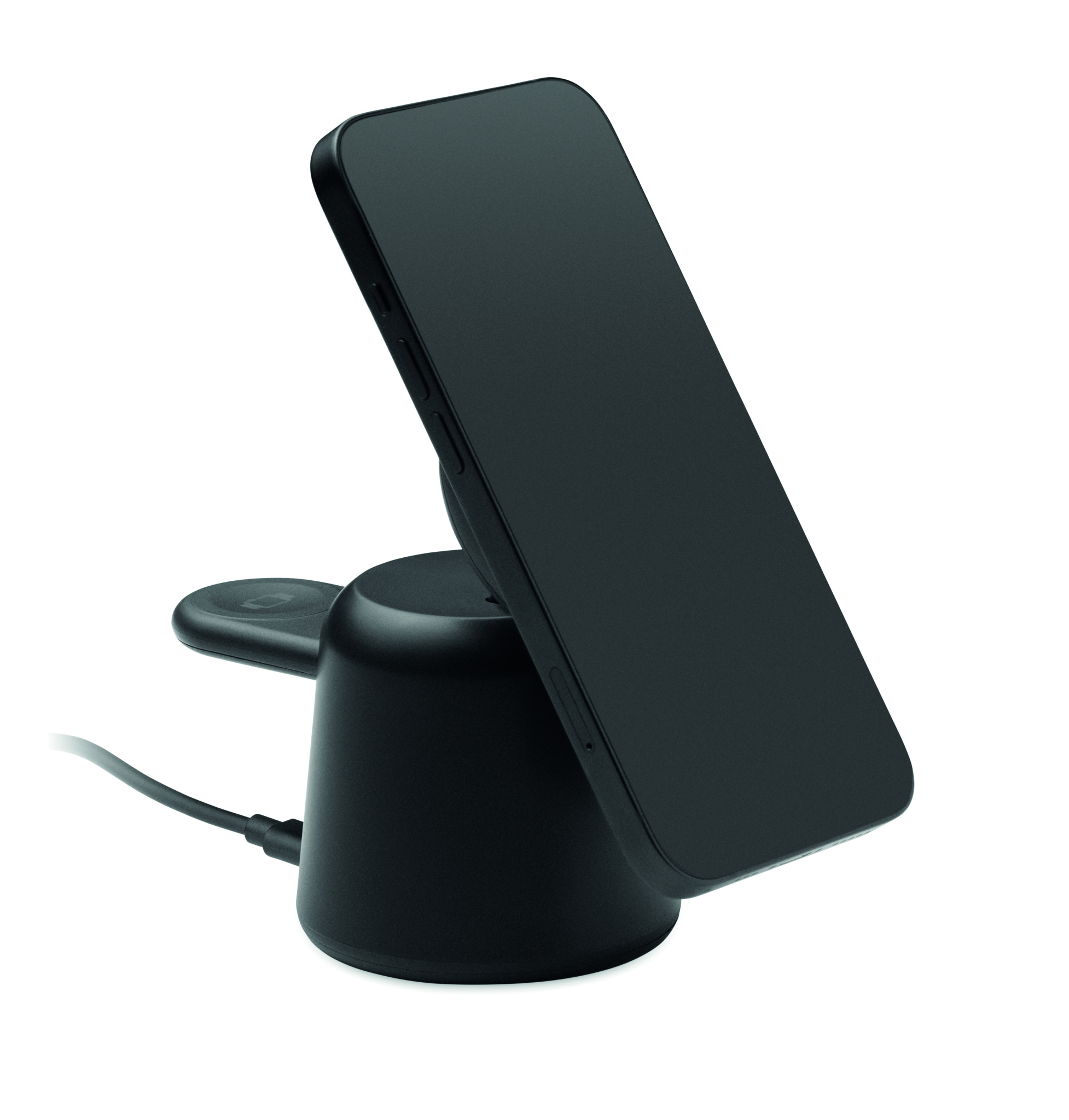 3 in 1 charging station in ABS. Includes 15W magnetic wireless charger for phone and TWS with phone holder functionality and smartwatch charger (iOS only). Magnetic feature compatible with iPhone® 12 and newer. Including additional magnetic metal ring to support charging of other non-magnetic wireless chargeable phones.