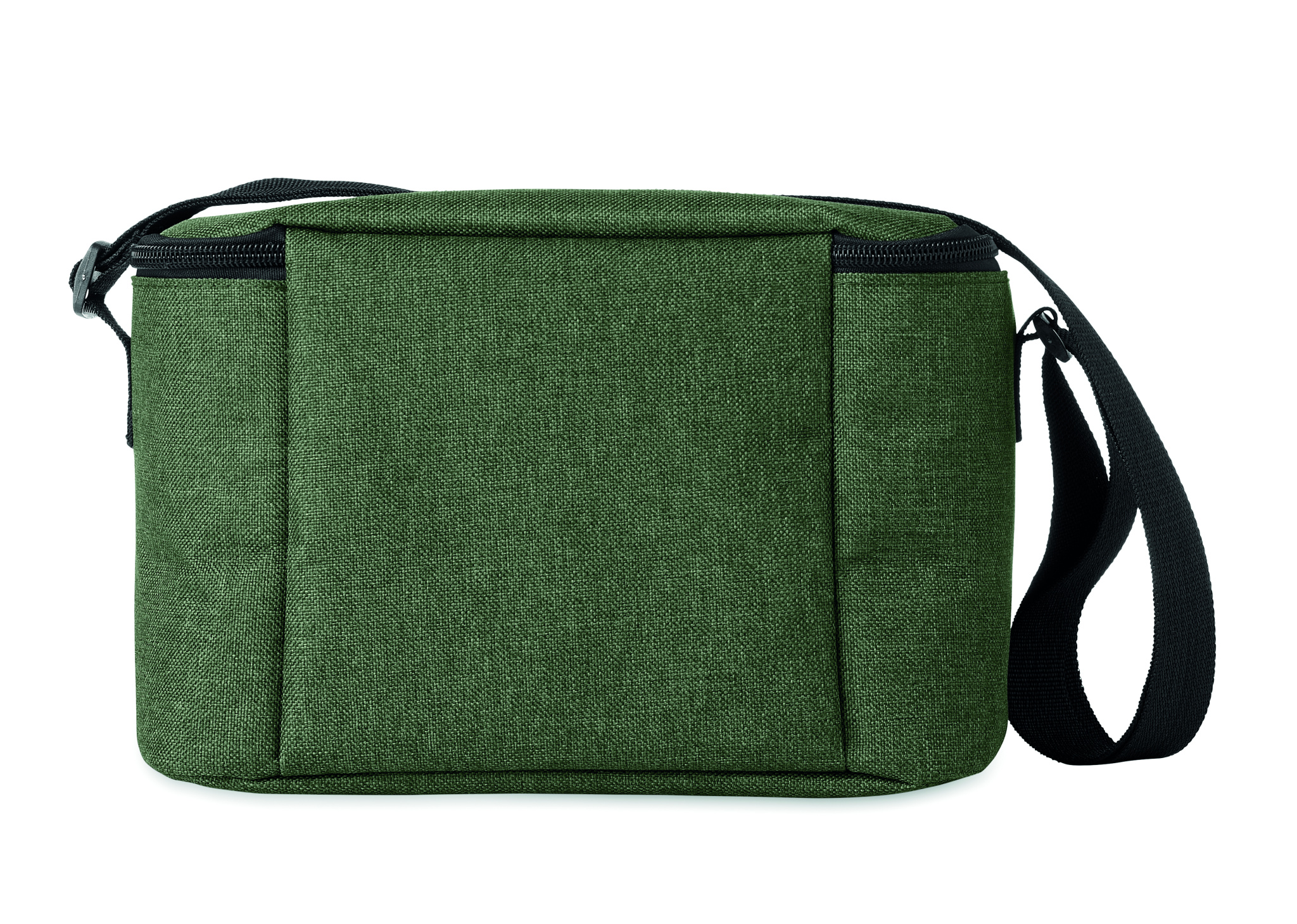 Cooler bag for 6 cans in 2 tone 600D RPET and front pocket. Capacity 3L. Isolation material: 0.15mm PEVA + 3mm foam.