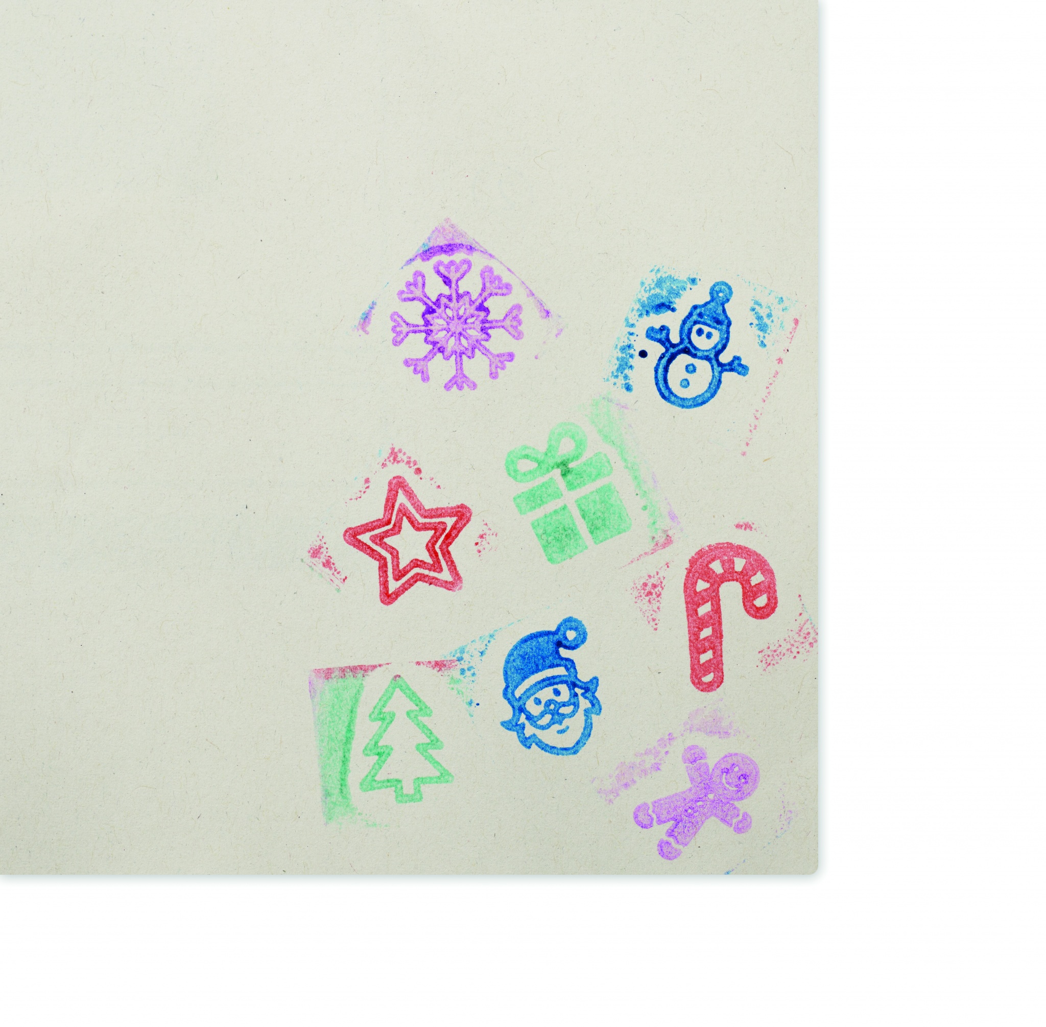 Set of 8 wooden Christmas stamps and multicoloured stamp inkpad with 4 different colours. Presented in a cotton drawcord bag.