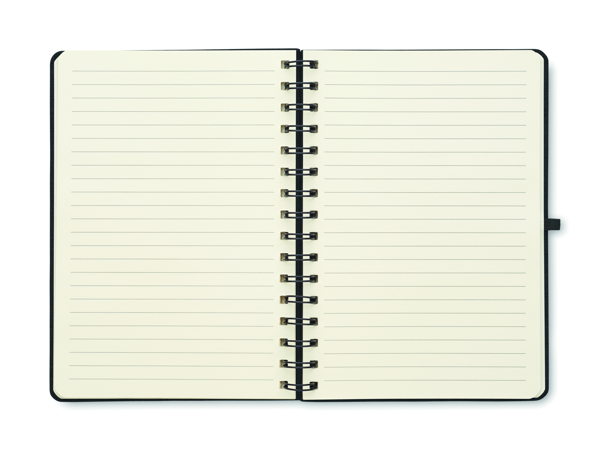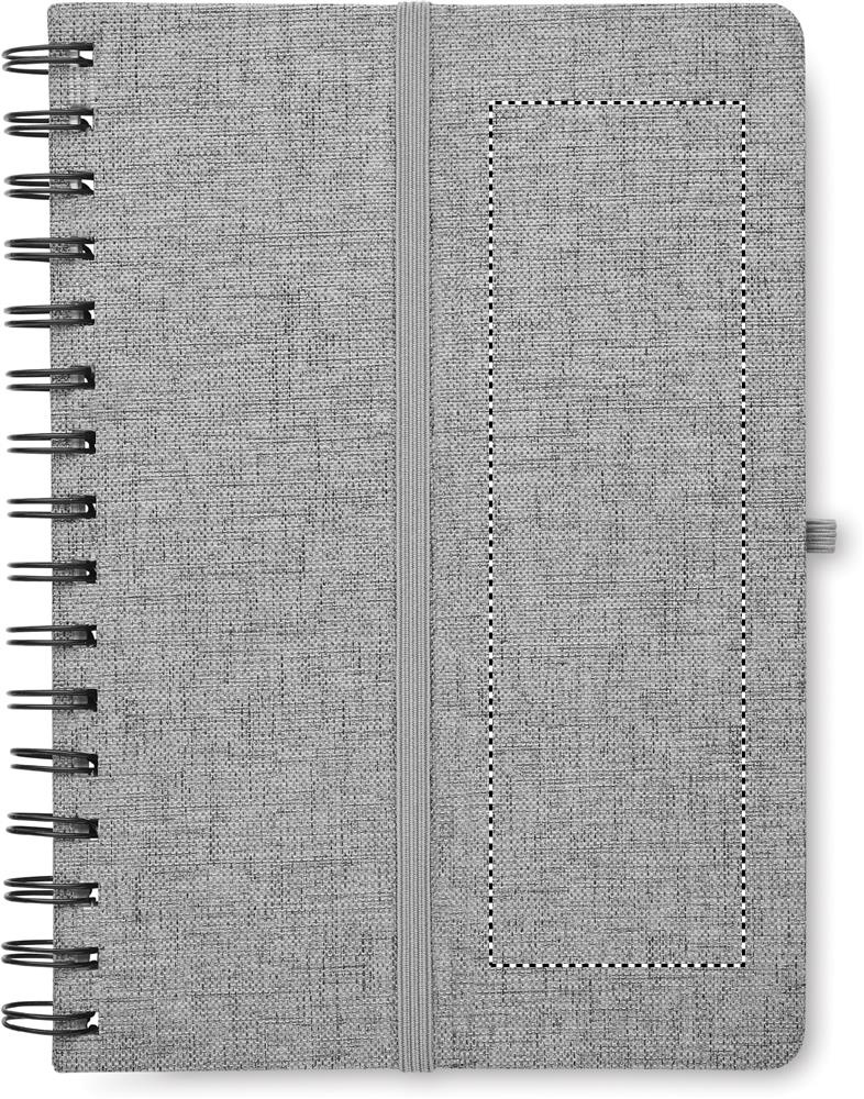 A5 notebook with 600D RPET hard cover with smartphone stand function. Twin-wire. 160 lined pages (80 sheets). 70 gsm recycled paper. Elastic closure strap.