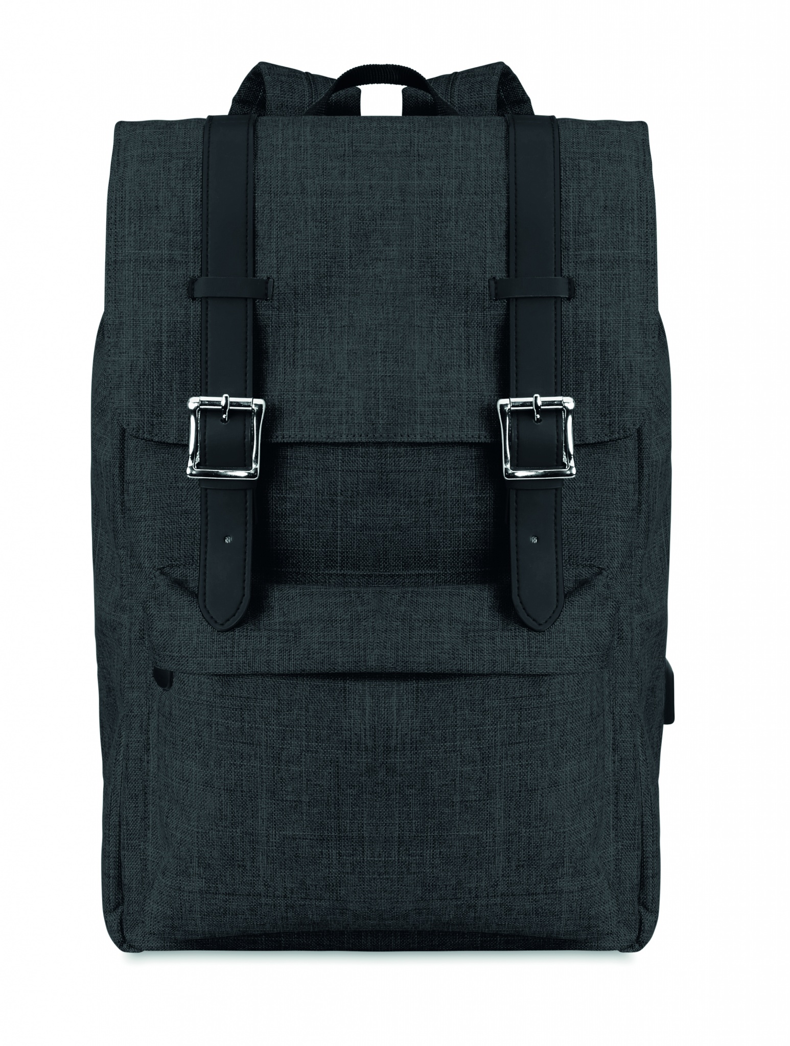 Laptop backpack in 600D 2 tone polyester with padded shoulder strap including one main internal compartment for 15 inch laptop and a USB charging cable. Includes magnetic snap button closure and one zippered front compartment.