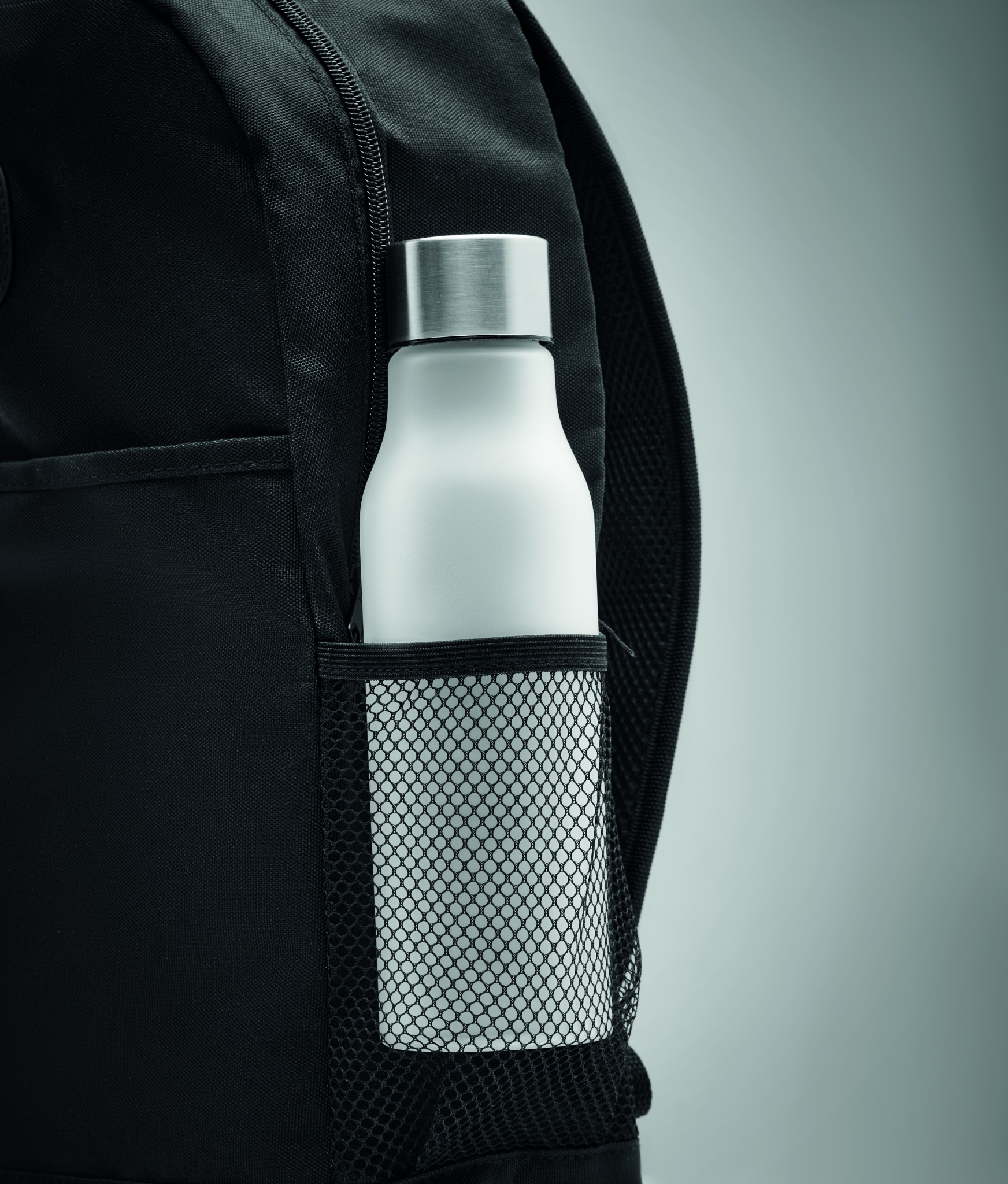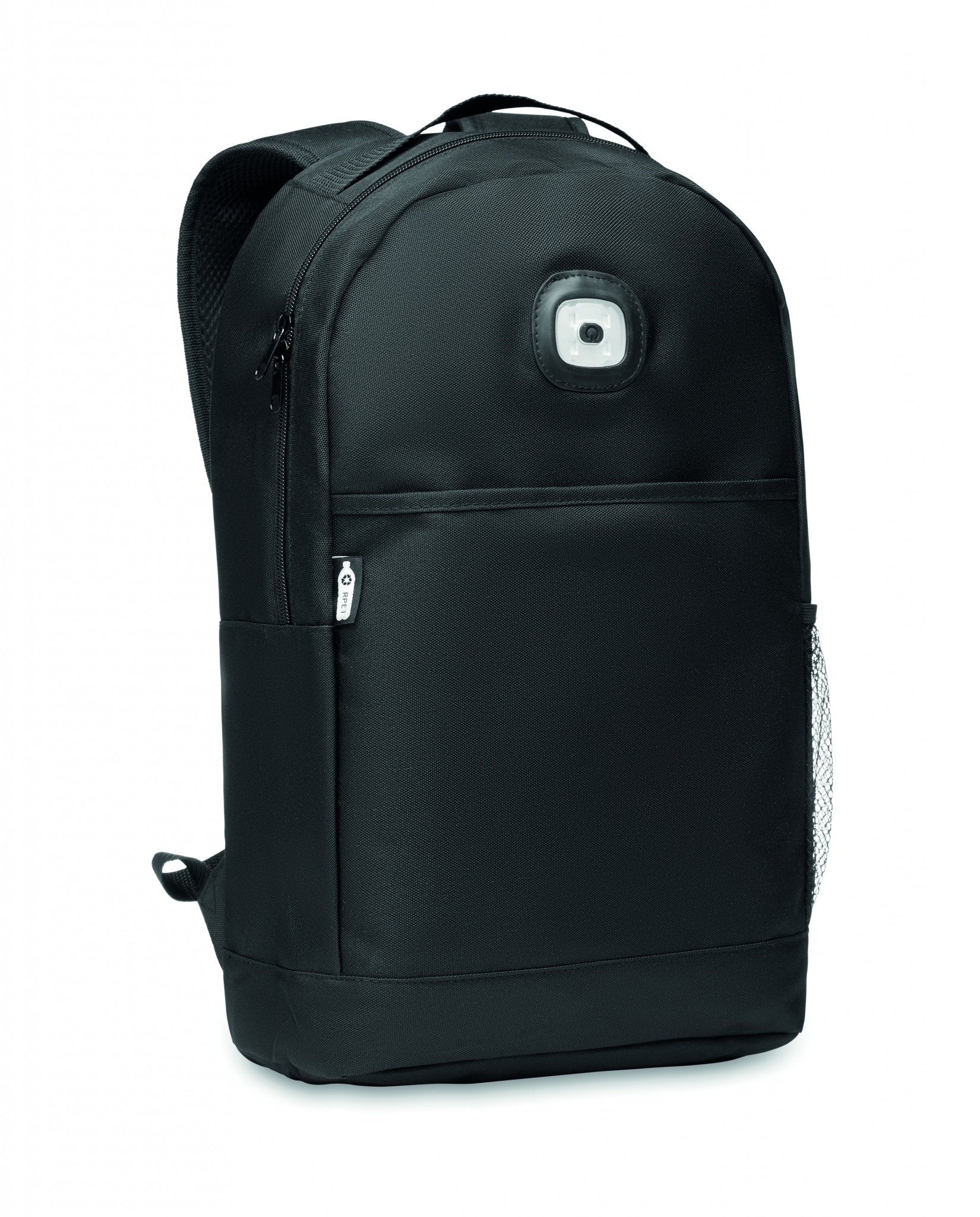 Backpack in 600D RPET with detachable COB light on the front panel. COB light in white colour with 3 different light brightness setting. Front pocket with hook and loop closure. Mesh pocket on the side. Button cell battery included.