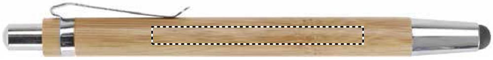 Push button ball pen in bamboo with stylus and shiny chrome fitting. Blue ink. Bamboo is a natural product, there may be slight variations in colour and size per item, which can affect the final decoration outcome.