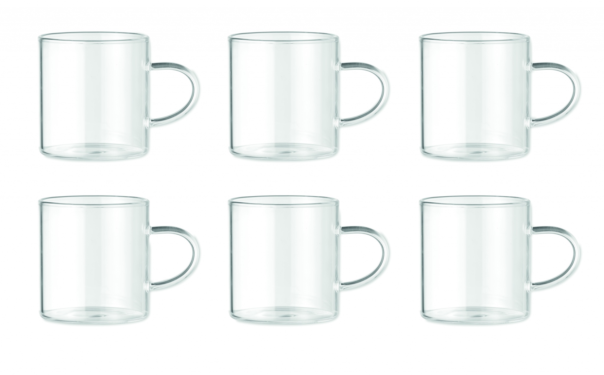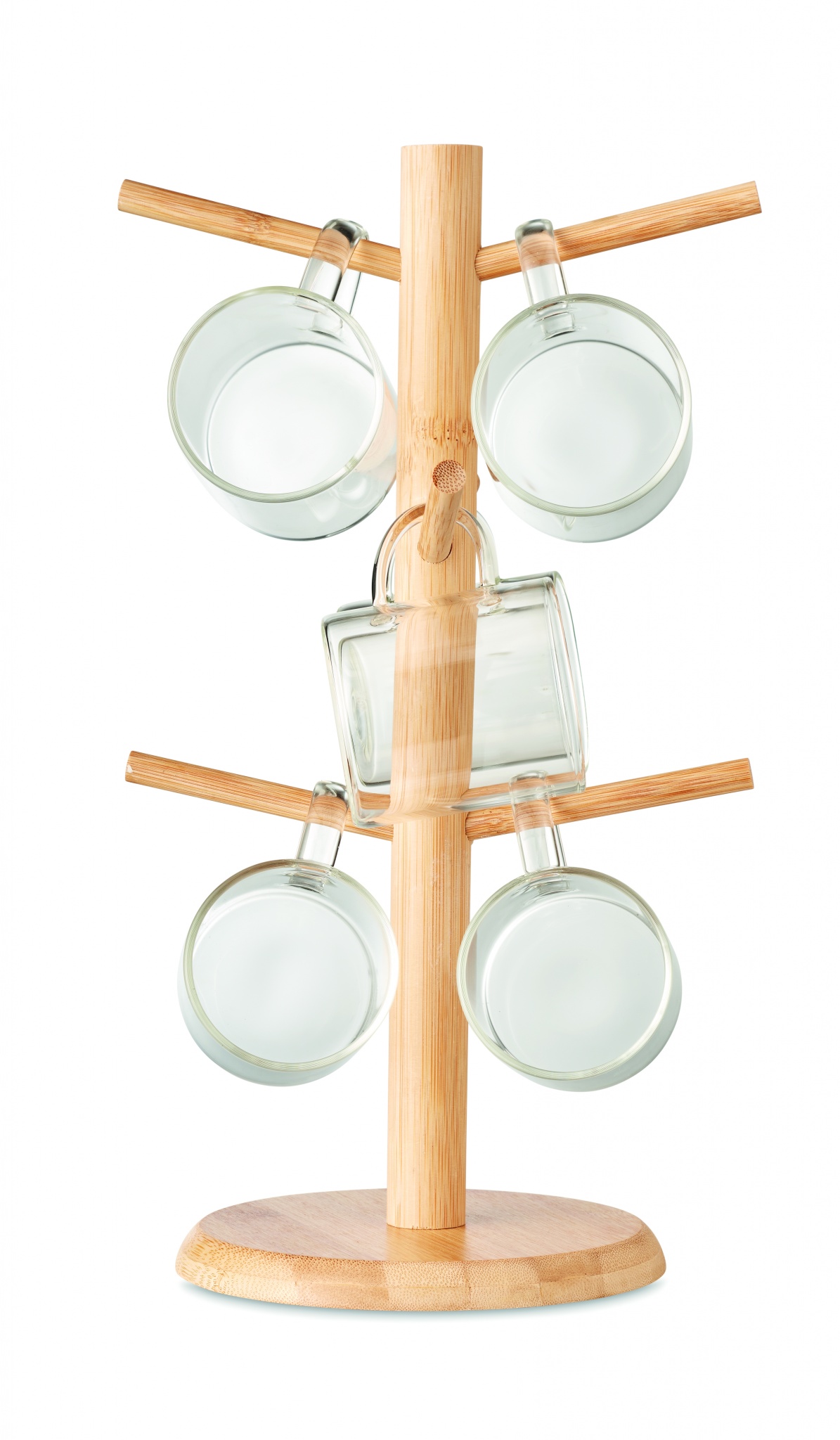 Set of bamboo cup holder including 6 borosilicate glass cups. Capacity: 200 ml per cup. Product assembly required. Bamboo is a natural product, there may be slight variations in colour and size per item, which can affect the final decoration outcome.