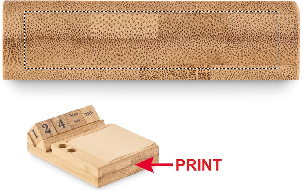 Bamboo desktop calendar with phone holder functionality, 2 pen holders and 50 sticky note sheets.