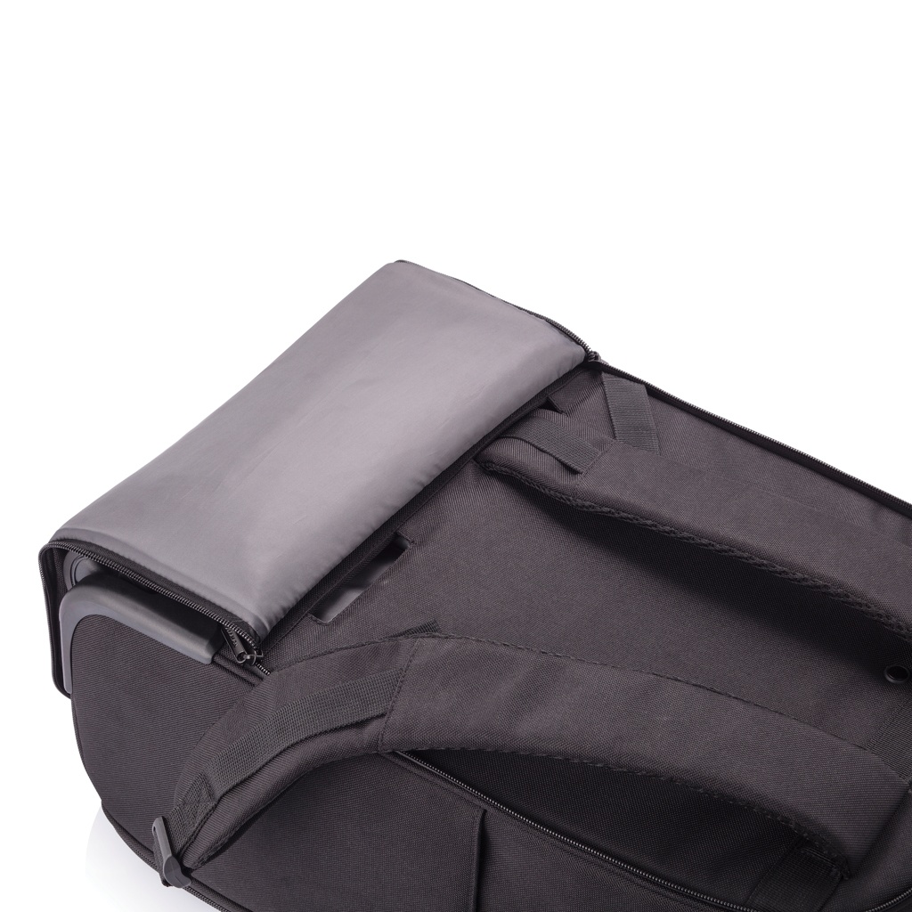 Convenient as a trolley and practical as a backpack. The Bobby backpack trolley is your ideal travel companion for short trips or daily commutes. Easily transform it from a backpack into a trolley by storing the shoulder straps in the back panel and releasing the handle. When switching into backpack mode, you can hide the handle and wrap the backpack around the wheels, keeping your back clean. The Bobby backpack trolley keeps you safe and connected with the well-known Bobby anti-theft features combined with a TSA® lock. Inside, you will find separate compartments for clothes and business devices with a quick-access laptop pocket. Made from R-pet fabric with the AWARE™ tracer. With AWARE™, the use of genuine recycled fabric is guaranteed. 19% recycled content. Registered design®