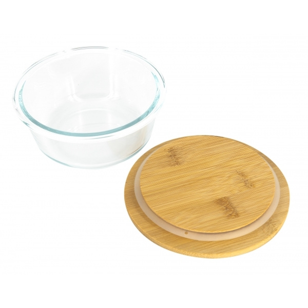 Universal bowl made of borosilicate glass with securely closing bamboo lid and a filling capacity of 300 ml. Your logo will be engraved on the lid.