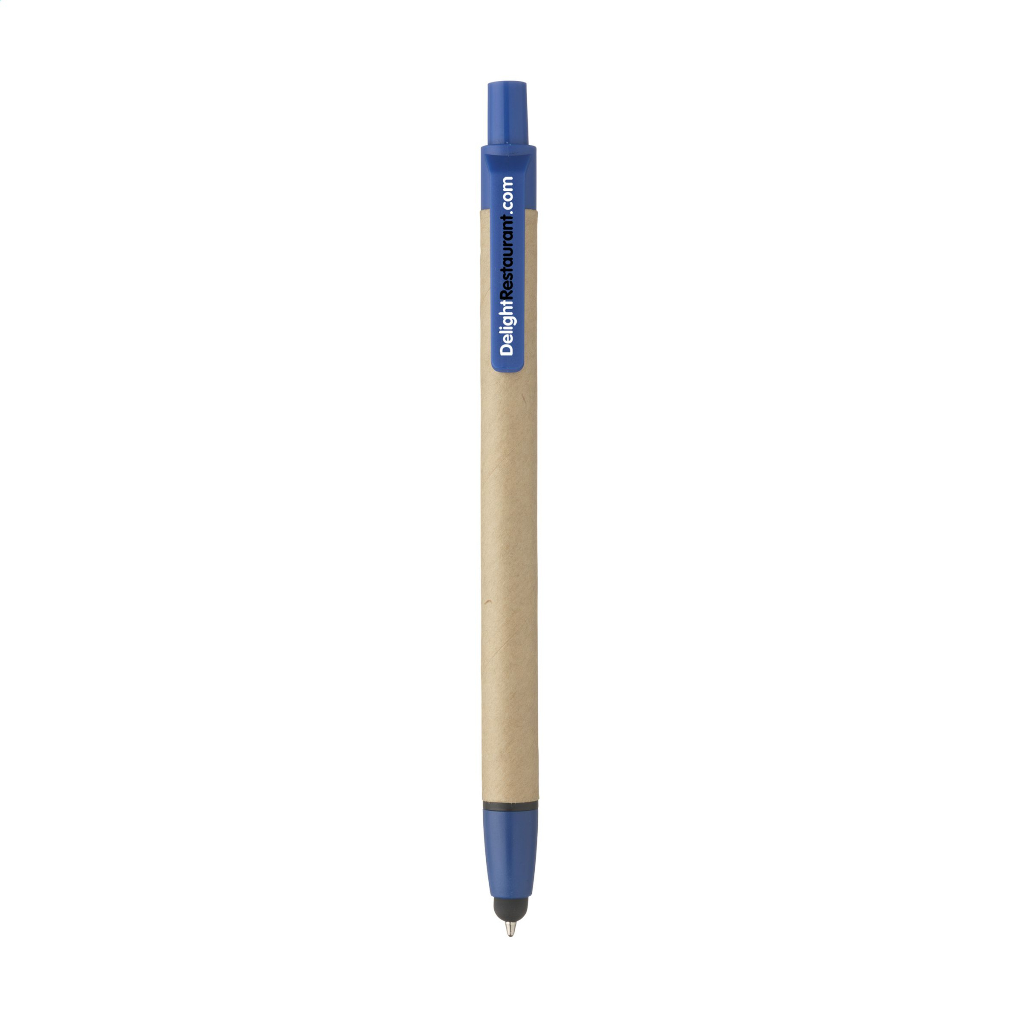 WoW! Blue ink ballpoint pen with barrel, made from recycled cardboard, rubber pointer to operate touch screens and plastic accents.