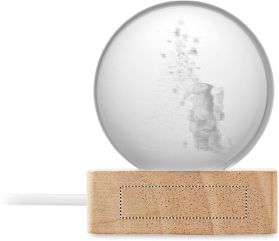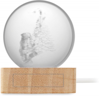 Crystal Christmas ball ornament with LED light (100 lumens) on a rubber wood base. Includes a USB charging cable (90 cm).