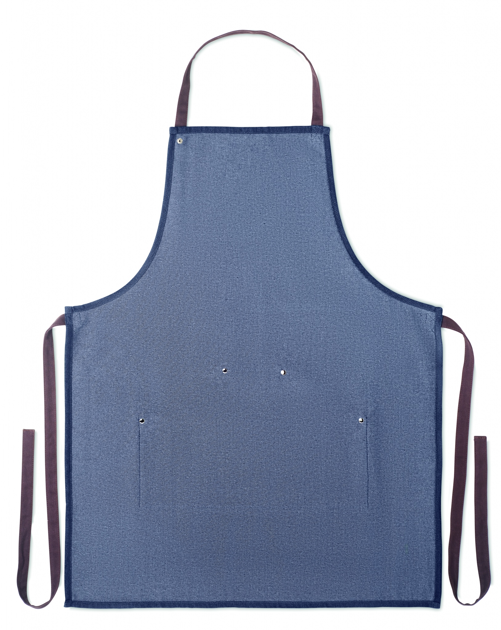 Adjustable kitchen apron with 3 front pockets in 240 gr/m² denim with cotton straps. Presented in individual box.