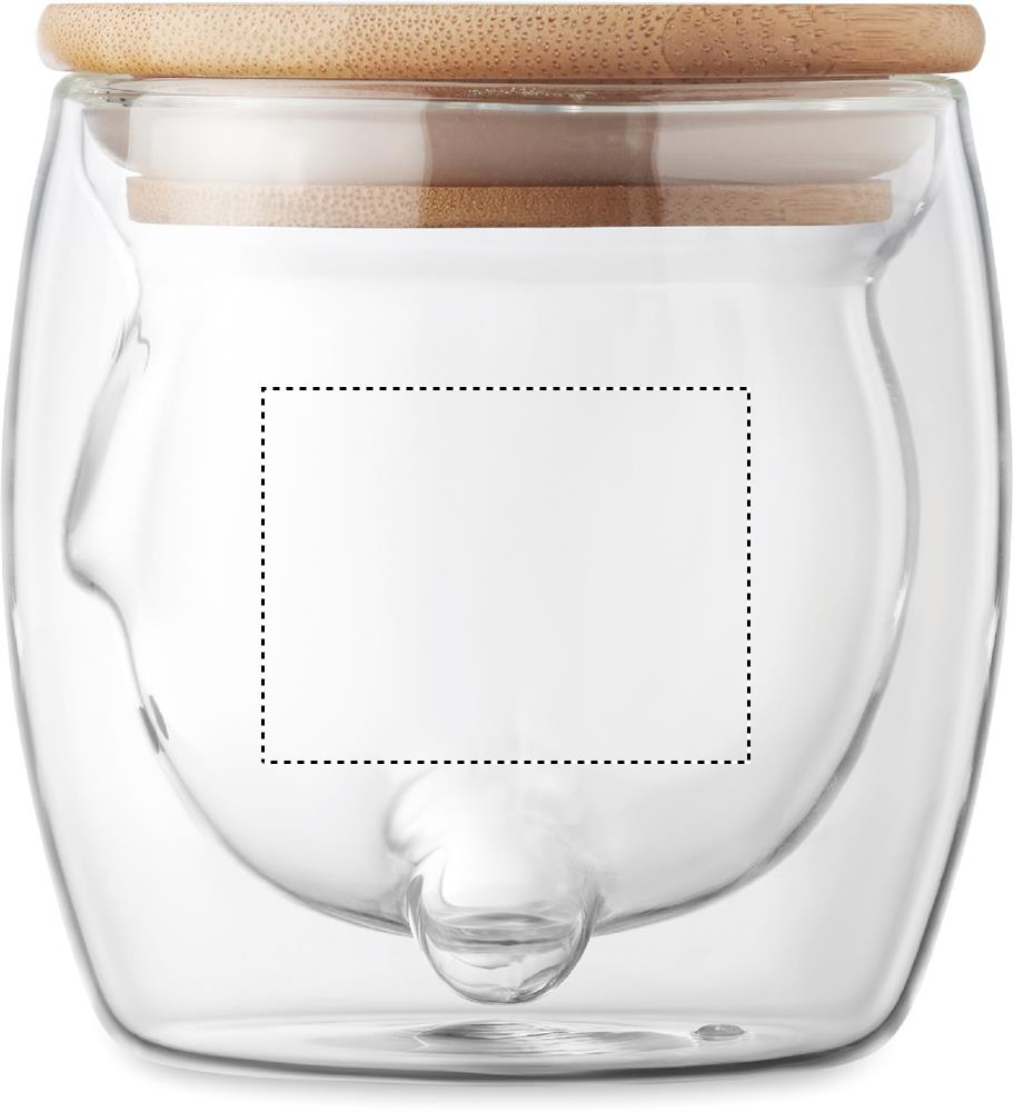 Double wall borosilicate glass mug with bear face design and bamboo lid. Capacity: 260ml. Bamboo is a natural product, there may be slight variations in colour and size per item, which can affect the final decoration outcome.
