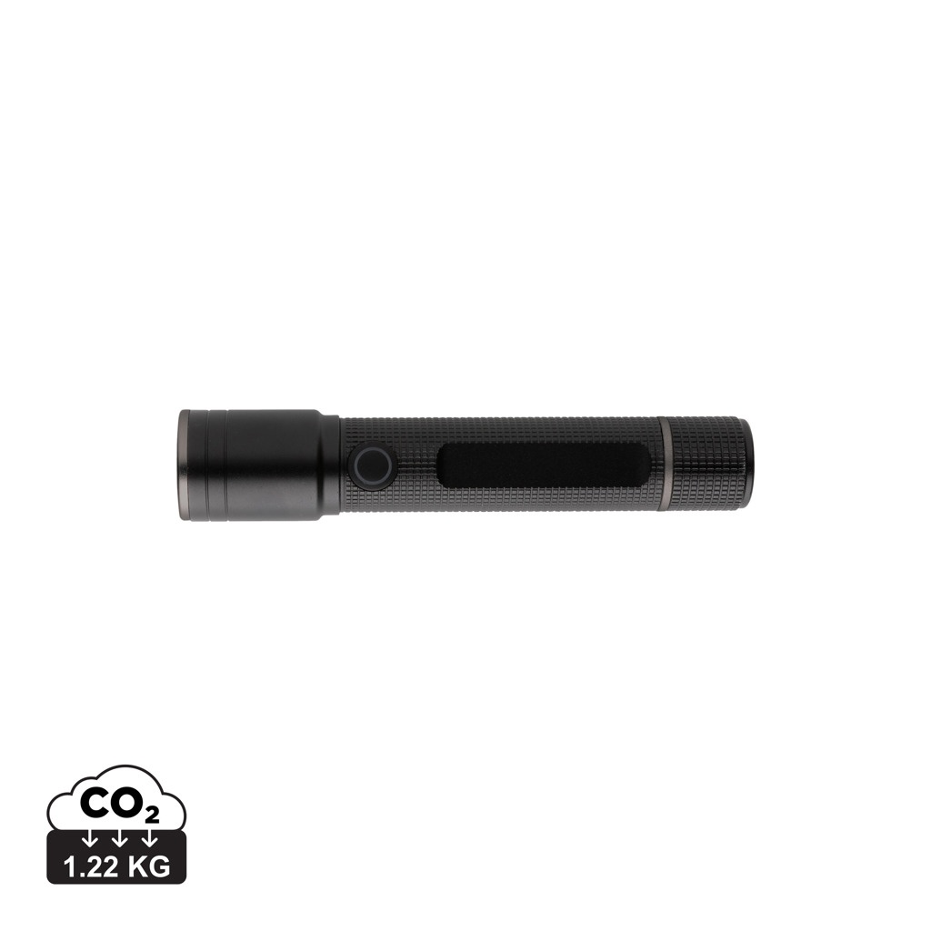 Functionality, performance and design all come together in this re-chargeable 3W torch made with RCS certified recycled aluminum. Total recycled content: 20% based on total item weight. RCS certification ensures a completely certified supply chain of the recycled materials. Because of its IP4 rating, it is weatherproof so can easily be taken outside. The powerful bulb creates up to 100 lumen and a beam that reaches up to 100 metres. The torch uses a re-chargable A-grade battery so no need to replace the batteries. Simply re-charge via your USB socket and the included RCS certified recycled type C cable. The high quality bulb comes with 5 modes including SOS function. The 500 mah battery allows a usage up to 4 hours on a single charge. Aluminum does not lose its characteristics in the recycling process and can be recycled endlessly. Item and accessories 100% PVC free. Packed in FSC mix packaging.