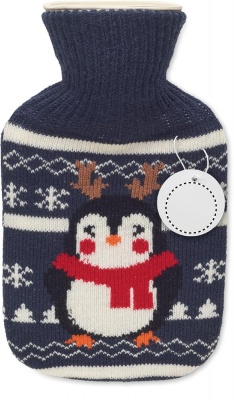 Hot water bottle with jersey in Christmas pattern. Used to provide warmth, typically whilst in bed, but also for the application of heat to a specific part of the body. 250 ml capacity.