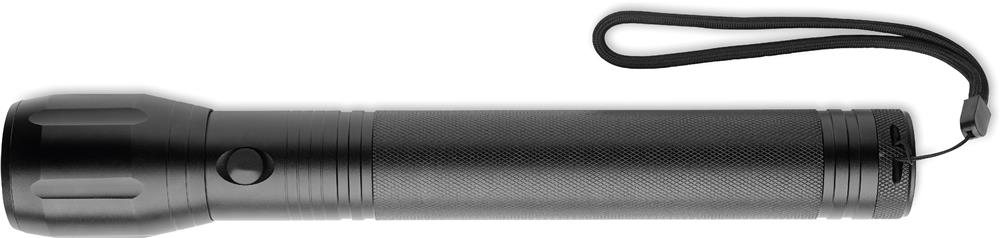 Large aluminium zoomable 1 LED flashlight torch and detachable strap. Output: 300 lumen. 3 D batteries excluded.