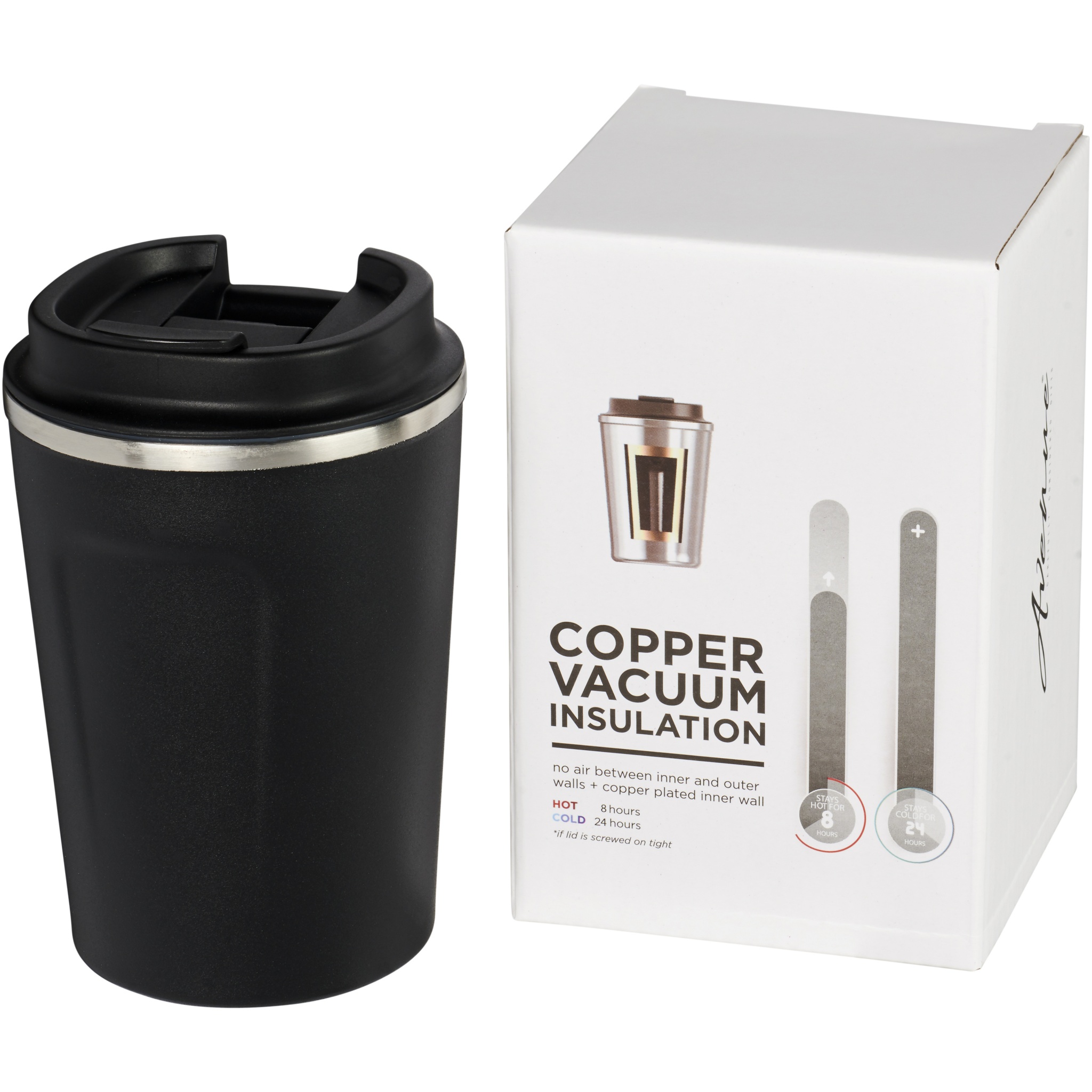 Double-wall stainless steel vacuum construction with copper insulation, which allows beverages to stay cold for 24 hours or hot for at least 8 hours. The construction also prevents condensation on the outside of the tumbler. Screw-on leak-proof lid. On-trend, durable powder coating. Volume capacity is 360ml. Presented in an Avenue gift box.