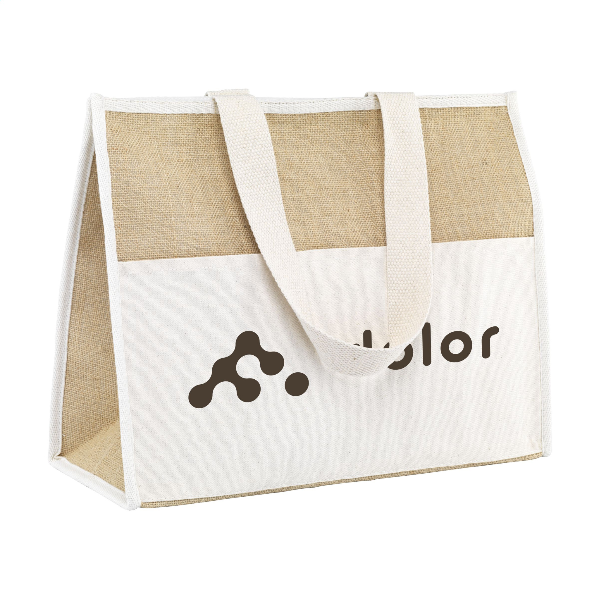 WoW! Spacious shopping / cooler bag with insulating, aluminium interior and Velcro closure. Ideal for transporting frozen items and also suitable for keeping food and drinks cool during a day out. Supplied in natural colours with a material combination of sturdy jute and cotton. Long, woven handles. The Velcro front pocket offers extra storage space. Suitable as a shopping bag, cooler bag or beach bag. Capacity approx. 28 litres.