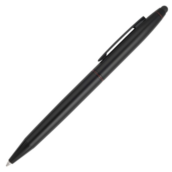 Luxury metal ballpoint pen Pierre Cardin with a stylus and a rotary mechanism. The pen´s body is designed in elegant full black design with two red rings. It contains a quality blue refill with the tip 1 mm. Packaged in a luxury pocket Pierre Cardin, comes with a certificate of authenticity.
