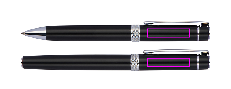 Writing set consisting of a twist ballpoint pen with blue writing system refill and a blue writing rollerball made of aluminum in a case. The chrome applications and the sparkling decorative rings give the set its elegant look. Your logo will be engraved on both pens to the right of the clip.
