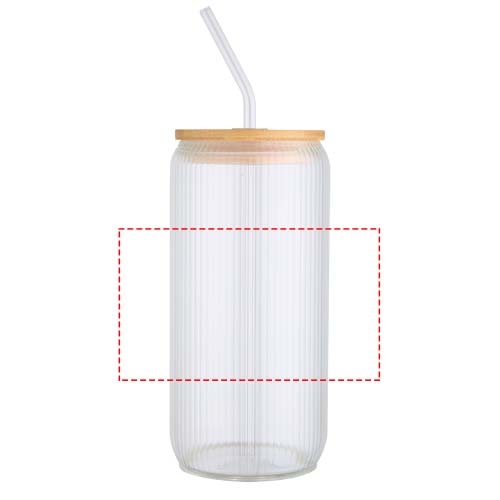 Borosilicate glass jar with a glass straw and bamboo lid. The jar has a unique ribbed design on the interior and a smooth exterior, ideal for printing a logo. The bamboo used is sourced sustainably, with respect for environmental and social responsibility. Supplied in a recycled cardboard gift box. Volume capacity: 650 ml.