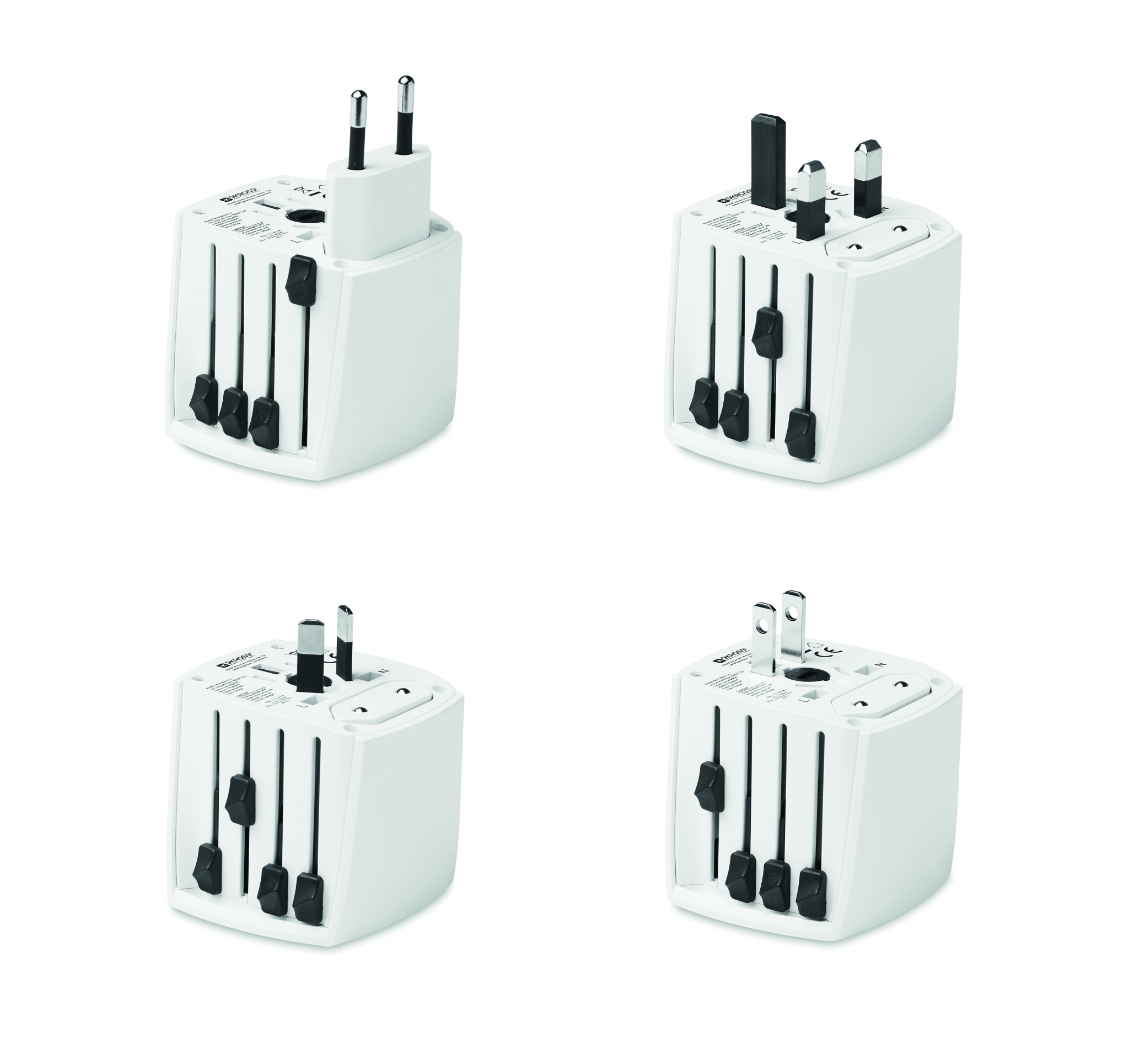 Universal SKROSS® travel adapter. Receptacles for Europe, USA/Japan, Australia/China.   2-pole, unearthed. Fulfils all international security-relevant standards and norms. Even child safe.