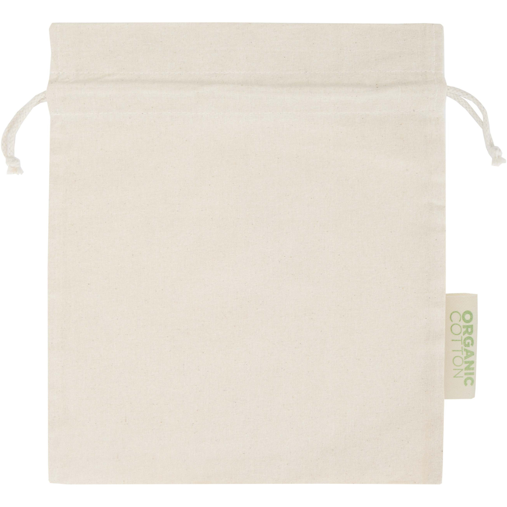Gift bag made of 100% OCS certified 140 g/m² organic cotton featuring a cotton drawstring closure. Ideal for gifting or storing items. Size: 30 x 25 cm.
