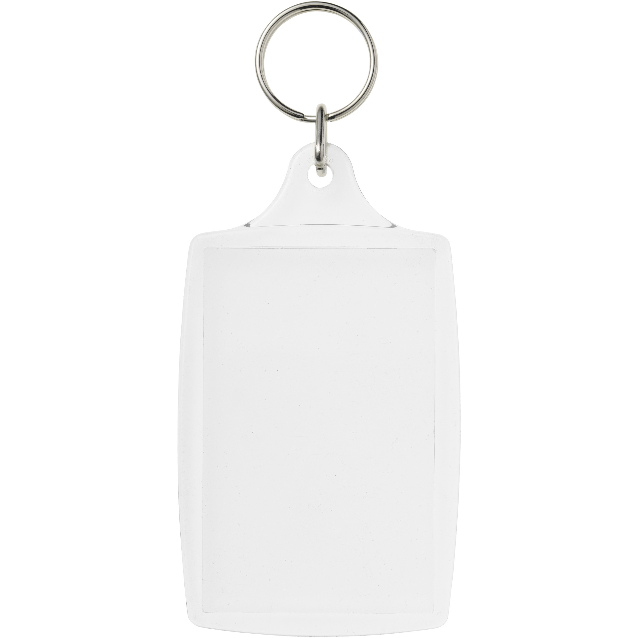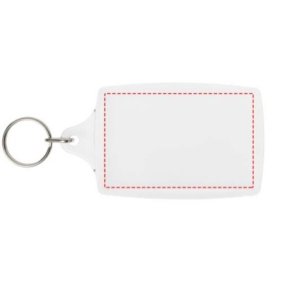 Clear L4 keychain with metal split keyring. The metal looped ring offers a flat profile which is ideal for mailings. Print insert dimensions: 7 cm x 4,5 cm.