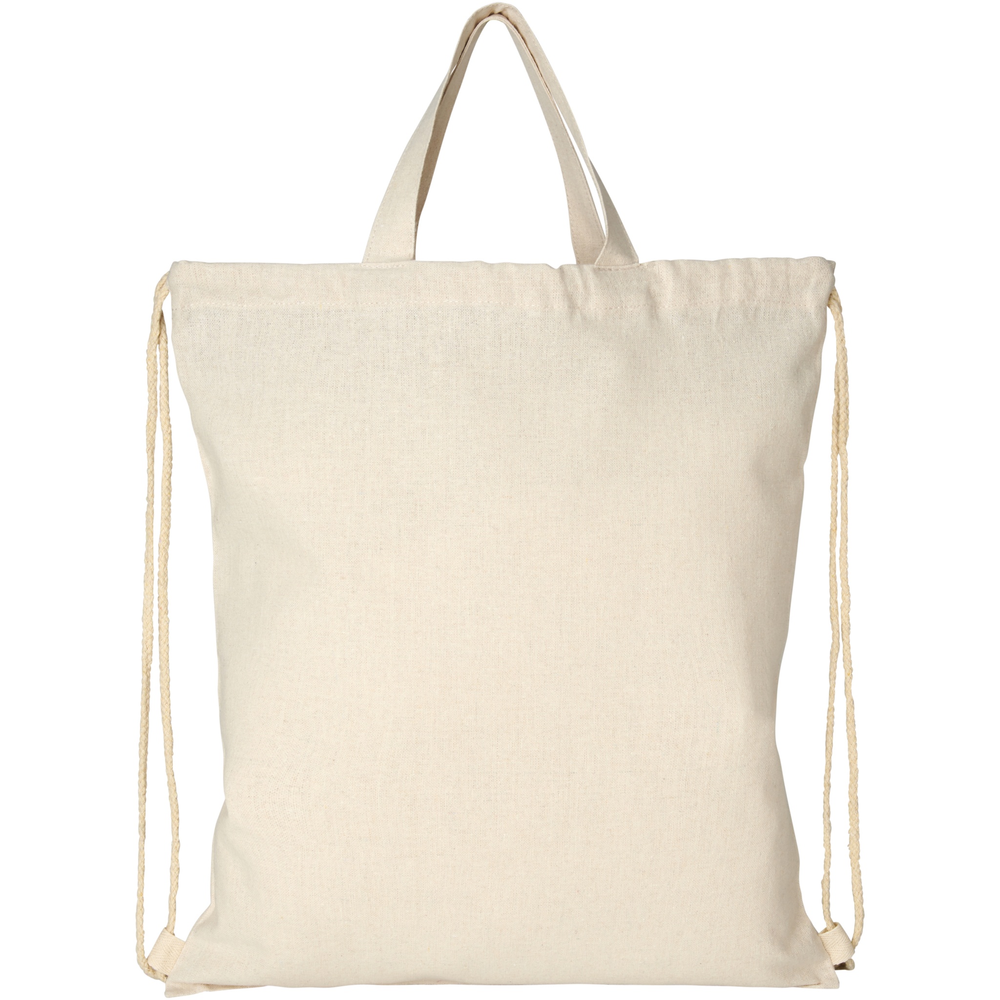 Drawstring bag made of 210 g/m² recycled cotton polyester blend. Recycled cotton is manufactured from pre-consumer waste generated by textile factories during the cutting process. Large main compartment with cotton drawstring closure. Features two handles with a dropdown height of 14 cm. Resistance up to 5 kg weight. There may be minor variations in the colour of the actual product due to the nature of the production process.