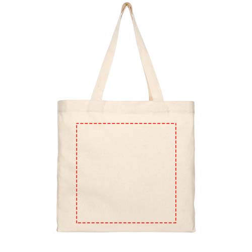 Tote made of 210 g/m² recycled cotton polyester blend. Recycled cotton is manufactured from pre-consumer waste generated by textile factories during the cutting process. Tote with gusset and large main compartment. Features two handles with a dropdown height of 31 cm. Resistance up to 10 kg weight. There may be minor variations in the colour of the actual product due to the nature of the production process.