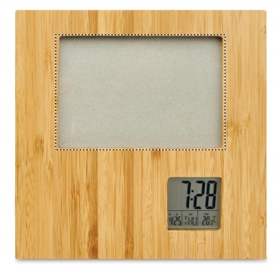 Photo frame in bamboo with weather station. Displays time, date and temperature. Alarm function and count down timer. 2 AAA batteries not included. Bamboo is a natural product, there may be slight variations in colour and size per item, which can affect the final decoration outcome.