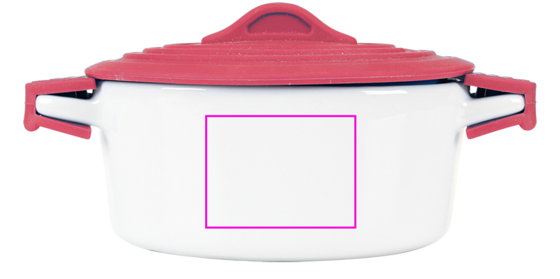 Porcelain pot (suitable for dishwasher, oven and microwave), with heat resistant silicone handles (up to 250 °C). Your logo will be printed on the pot in ceramic transfer.