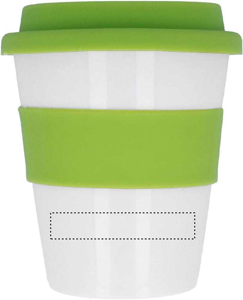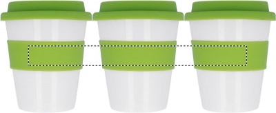 Single wall tumbler in shiny white PP with silicone lid and middle ring. Capacity 350 ml. As this is a single walled mug heat transfer can still occur.