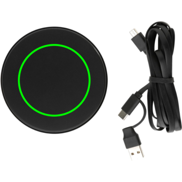 10W wireless charger with dual connector cable (USB A and USB C) where the case is made out of RCS certified recycled ABS plastic and the wire from recycled TPE. Total recycled content 58% based on total item weight. RCS (Recycled Claim Standard) is a standard to verify the recycled content of a product throughout the whole supply chain. RCS is the standard that is used when a part of the item has been made from recycled materials. Wireless charging compatible with Android latest generations, iPhone 8 and up. Input: 9V/1.5A. Wireless Output: 9V/1.1A 10W. Item and accessories PVC free. Including 150 CM PVC free recycled TPE cable that offers connection to both from USB A and type C adapters.