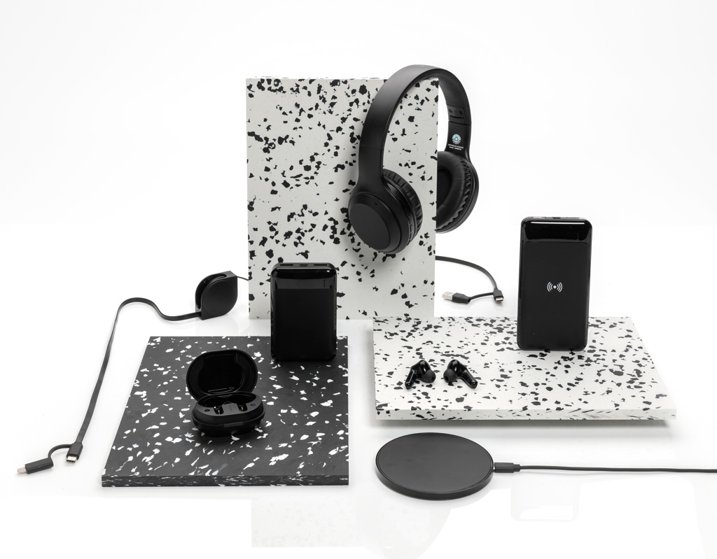 TWS earbuds where the the earbud and the charging case are made out of RCS certified recycled ABS plastic. RCS (Recycled Claim Standard) is a standard to verify the recycled content of a product throughout the whole supply chain. RCS is the standard that is used when a part of the item has been made from recycled materials. The wireless headphone uses BT 5.0 for super smooth connection and long lasting play-time. The 40 mah battery allows a play time up to 4 hours and can be fully re-charged in the 300 mah charging case in 1,5 hours. Operating distance up to 10 metres. With mic and touch pick up function. Item and accessories PVC free. Including PVC free recycled TPE material charging cable.