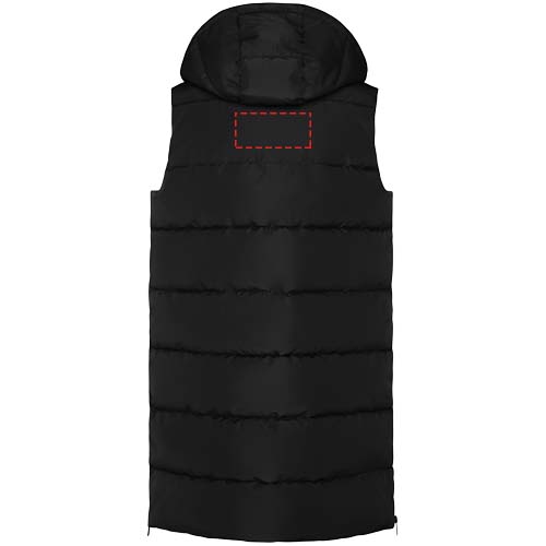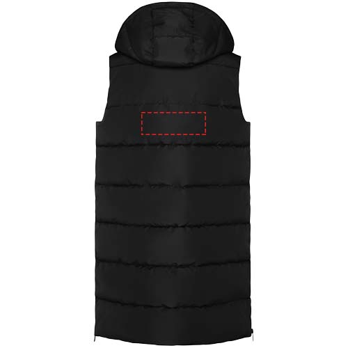 Padded bodywarmer with removable hood. High collar. Front zip closure hidden by flap. Two pockets with snap button closure. Side openings with zippers. Interior chest access. Water repellent.