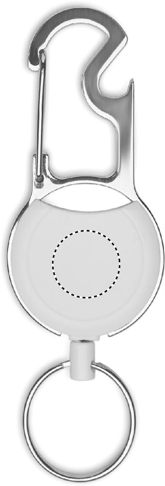 Retractable badge holder in ABS with clip, key ring and bottle opener.