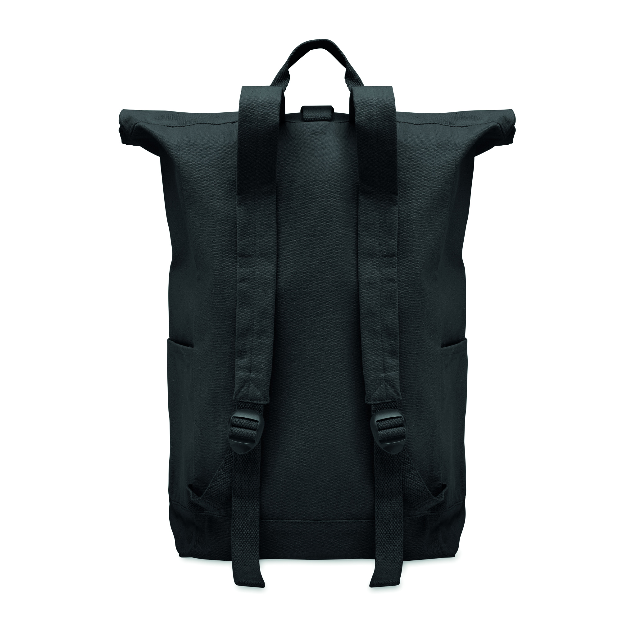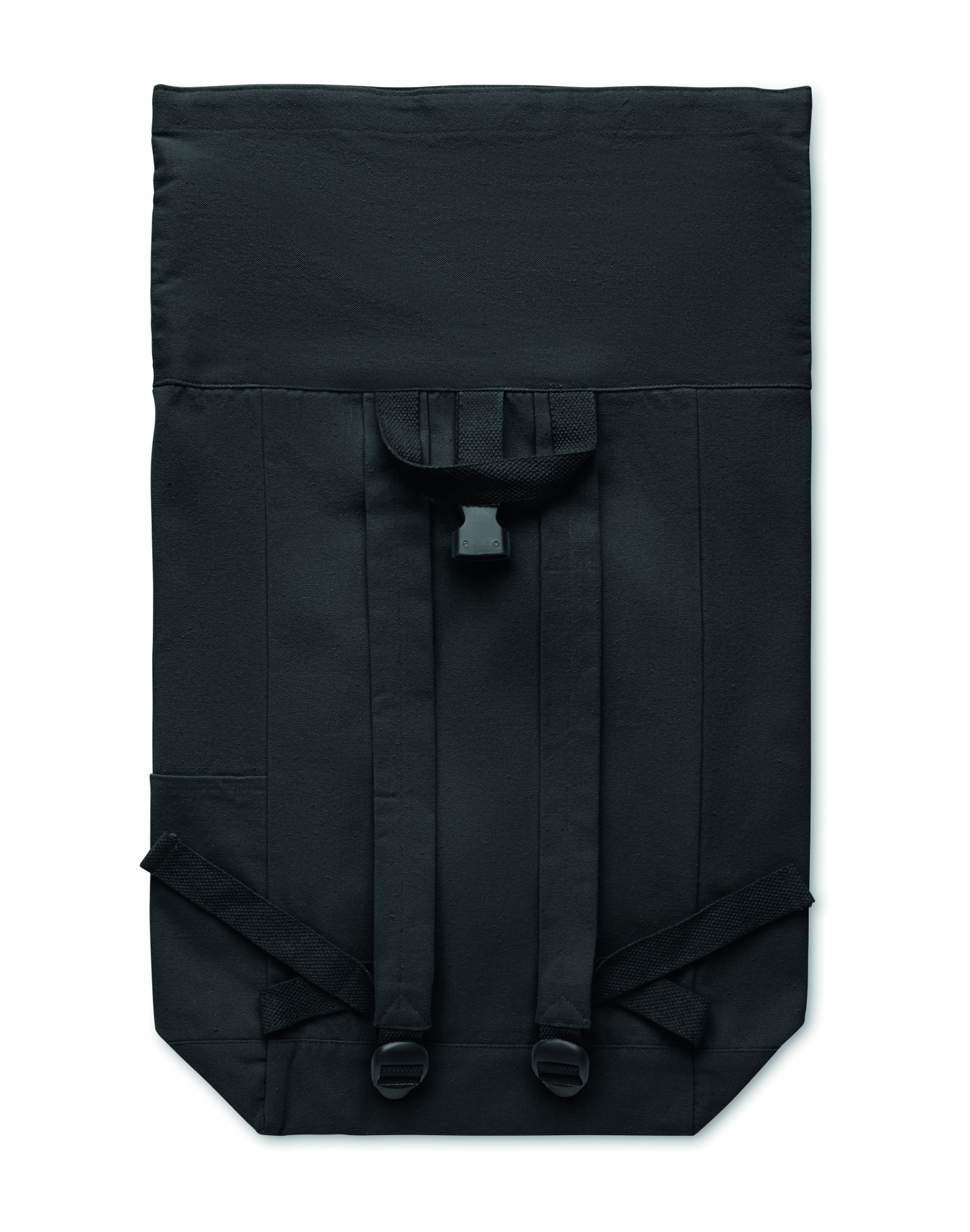Roll top backpack with hook and loop closure in 390 gr/m² recycled cotton (80%) and recycled polyester (20%). Zippered front pocket.