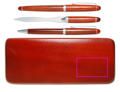 The rosewood set includes: a wooden ballpen with twist mechanism and blue-writing metal refill, a wooden fountain pen with blue-writing cartridge, and a letter opener. Your logo will be engraved on the box.