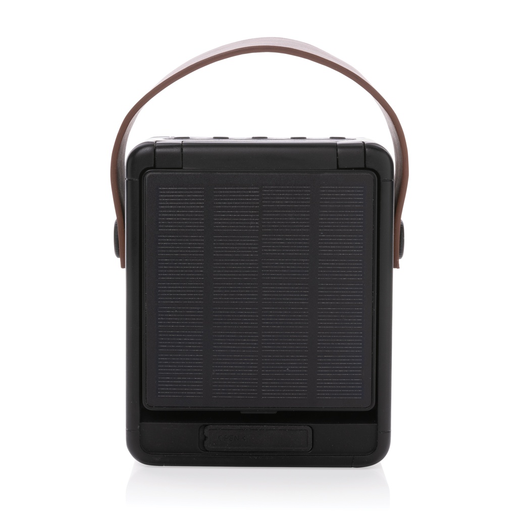 Powerful 12W wireless speaker with integrated large solar panel in RCS certified recycled ABS. Total recycled content: 16% based on total item weight. RCS certification ensures a completely certified supply chain of the recycled materials. The speaker uses high quality monocrystalline solar panels with 19% conversion rate. Charge rate depends on conditions. With integrated LED lamp to use the speaker even when the sun has set. The speaker is equipped with a 2000 mAh battery to ensure up to 8 hours of playing time and BT5.3 for smooth connection and clear sound. Connection range up to 10 metres. With mic and pick up function to answer calls. Charging speed solar: 5V/300mA. Packed in FSC mix FSC® box. Including RCS certified recycled TPE charging cable. Item and accessories 100% PVC free