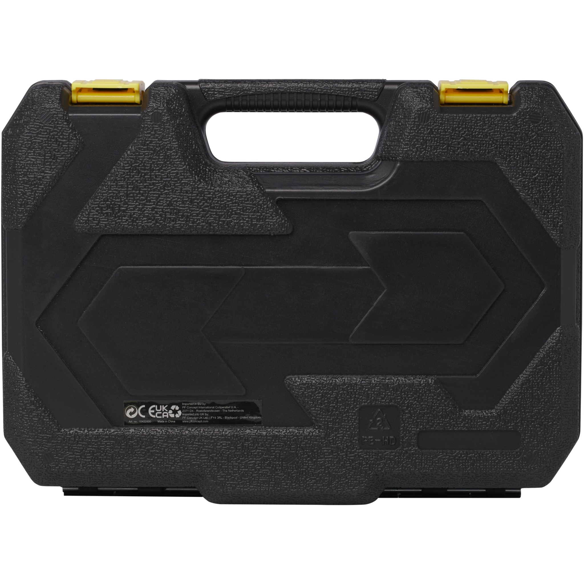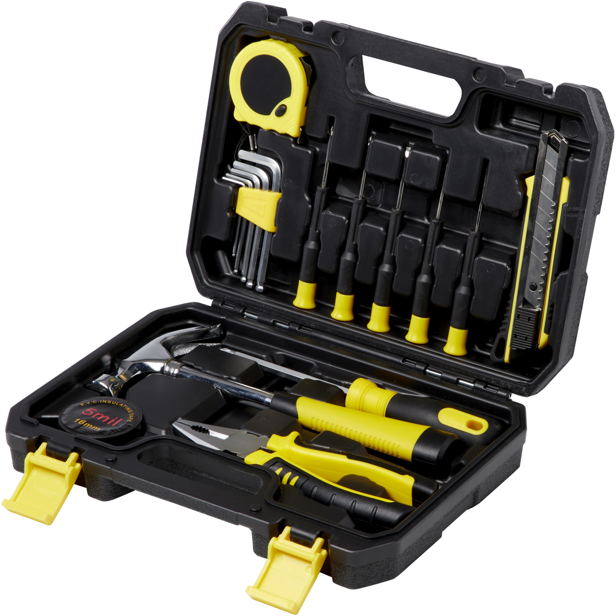 Tool case with click-mechanism locks and foldable carrying handle contains claw hammer, 4mm flat screwdriver, combination plier, cutter knife with locking feature, hex key holder containing 5 hex keys (2-6mm) with standard and ball ends. 3m measuring tape with locking system, voltage tester screwdriver, electrical tape and 4 precision screwdrivers.
