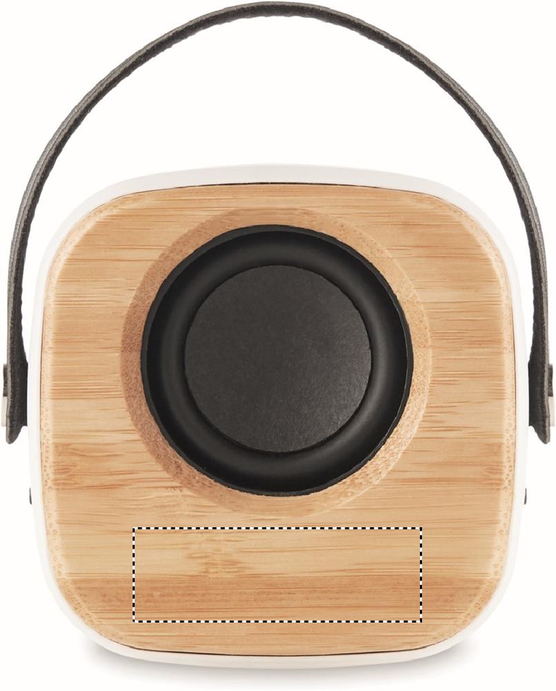 5.0 wireless speaker in ABS with bamboo front and PU strap. 1 Rechargeable Li-ION 500 mAh battery. Output data: 3W and 4 Ohm. Playing time approx. 4 hours. Bamboo is a natural product, there may be slight variations in colour and size per item, which can affect the final decoration outcome.