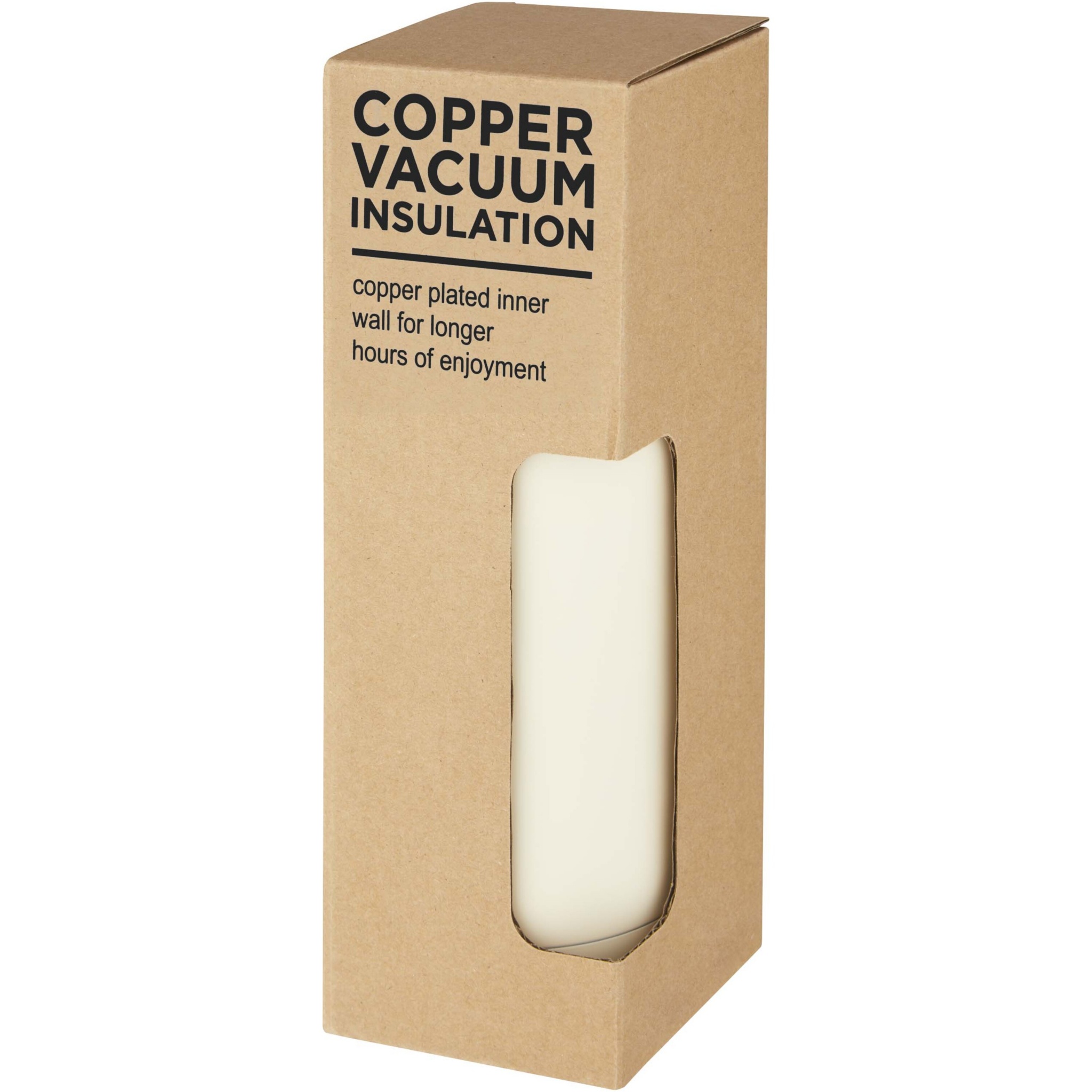 Copper vacuum insulated stainless steel bottle with clean design. The insulated 18/8 stainless steel construction prevents condensation on the inside of the bottle, and the on-trend matte powder-spray finish makes it extra durable. BPA-free, tested and approved under German Food Safe Legislation (LFGB). Tested and approved for phthalates content according to REACH regulations. Volume capacity is 500 ml. Hand wash recommended. Presented in a recycled cardboard gift box.