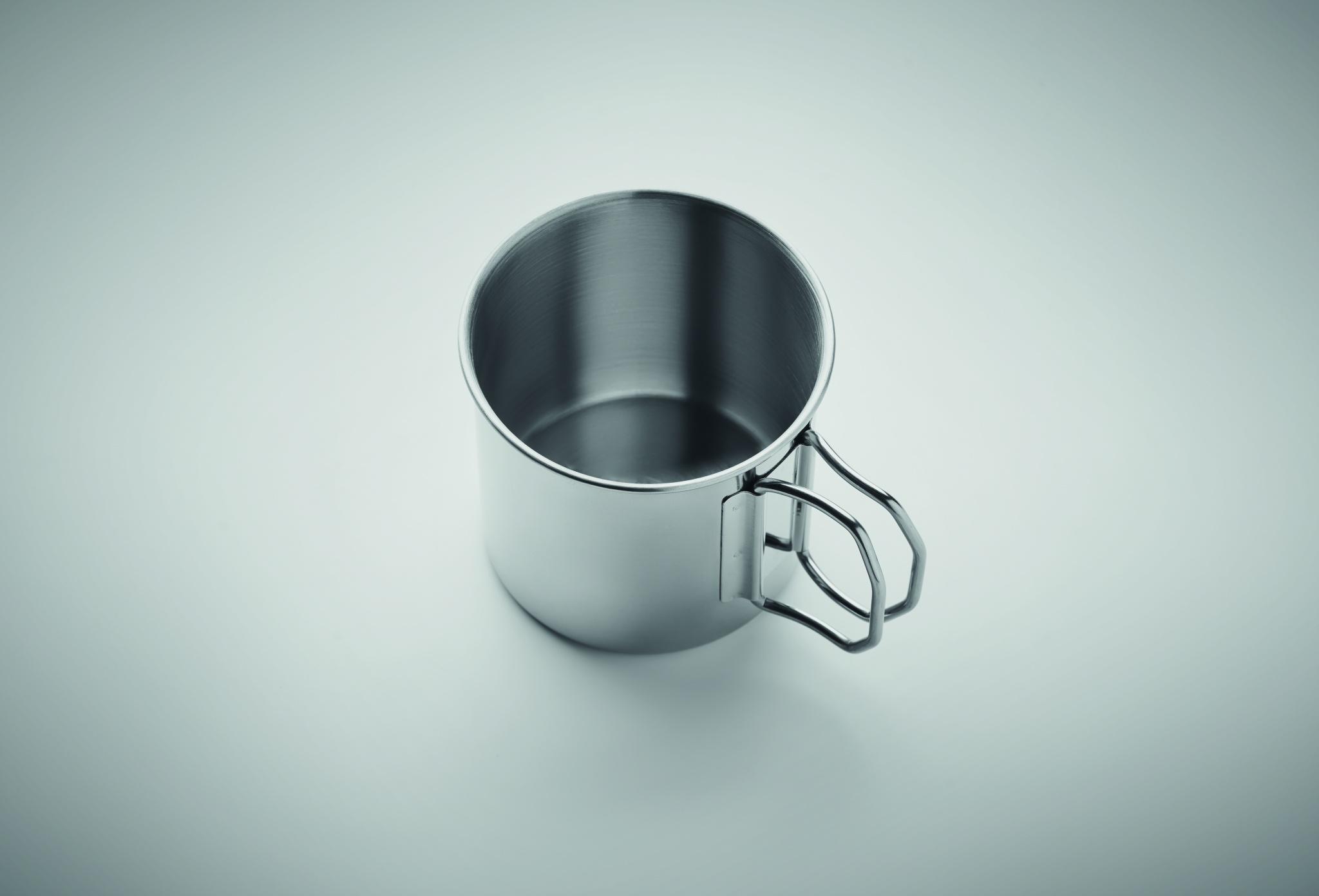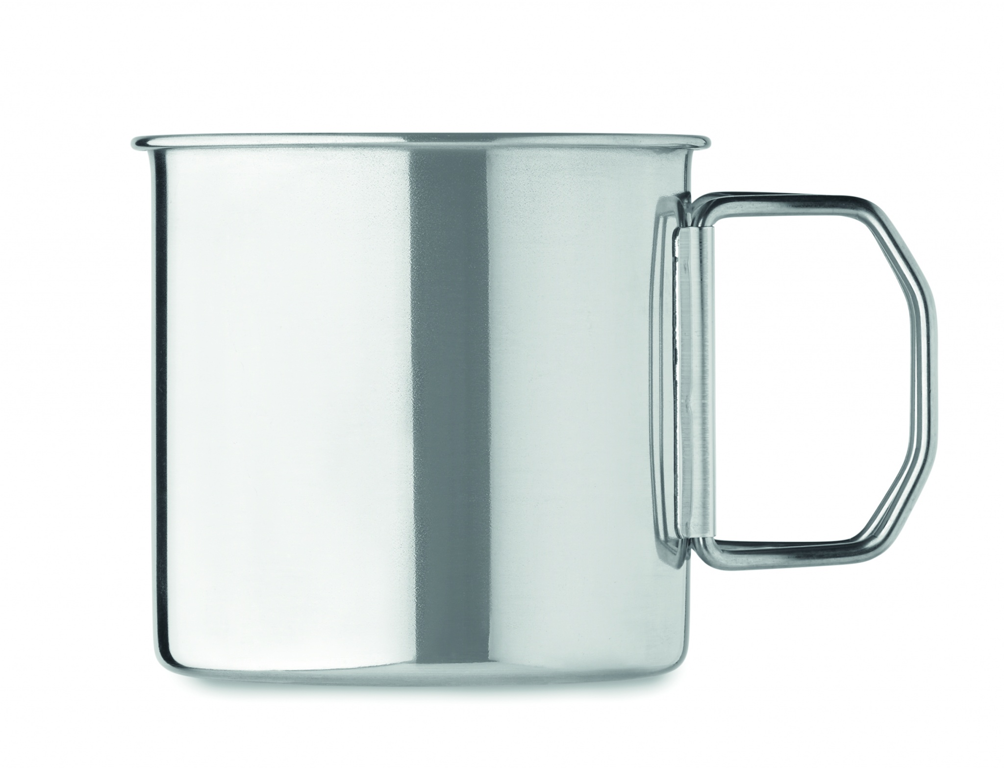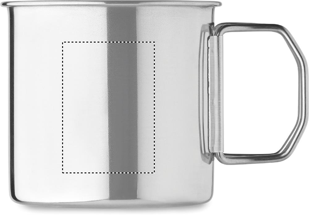 Single wall stainless steel mug with foldable handle. Capacity: 330 ml.