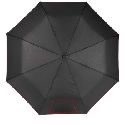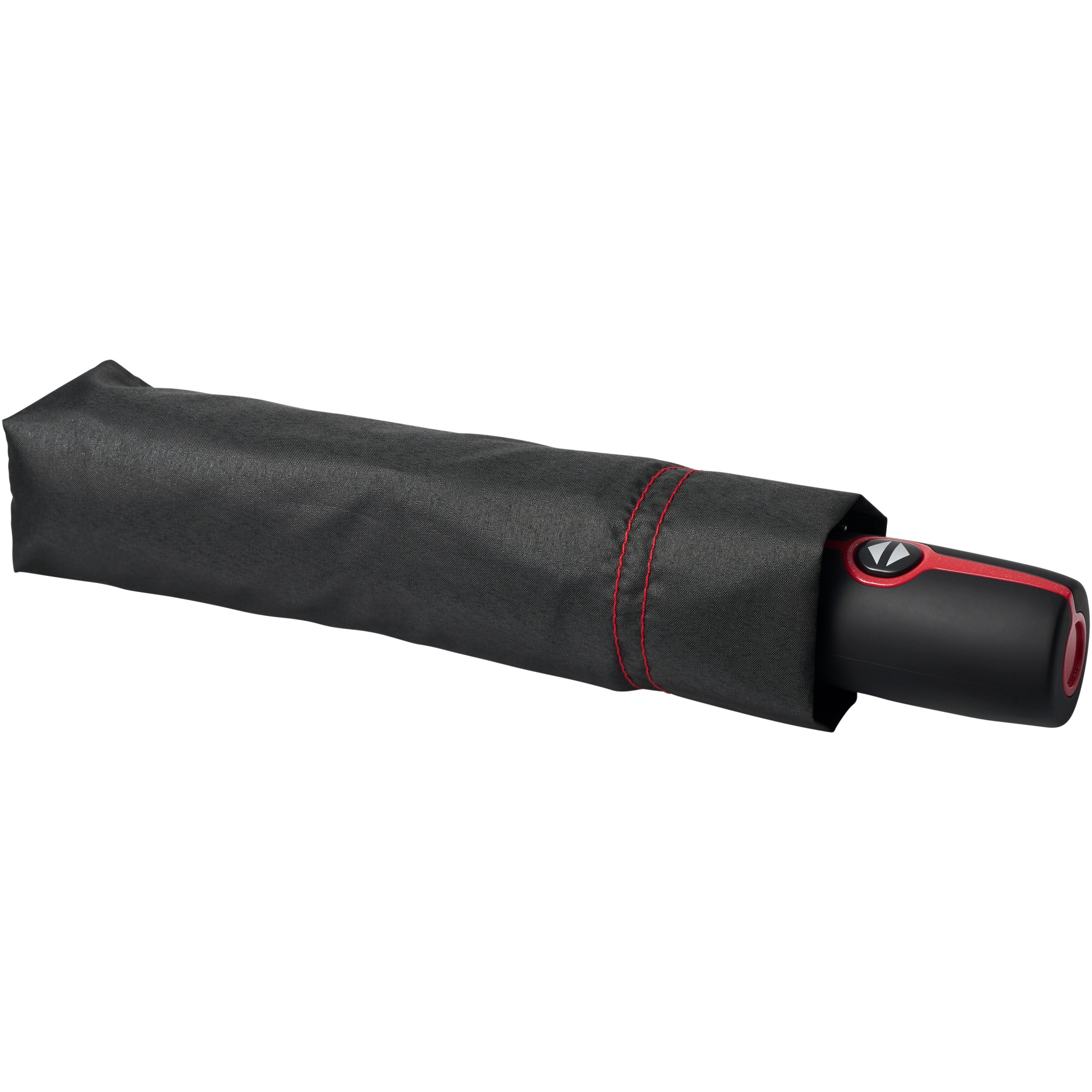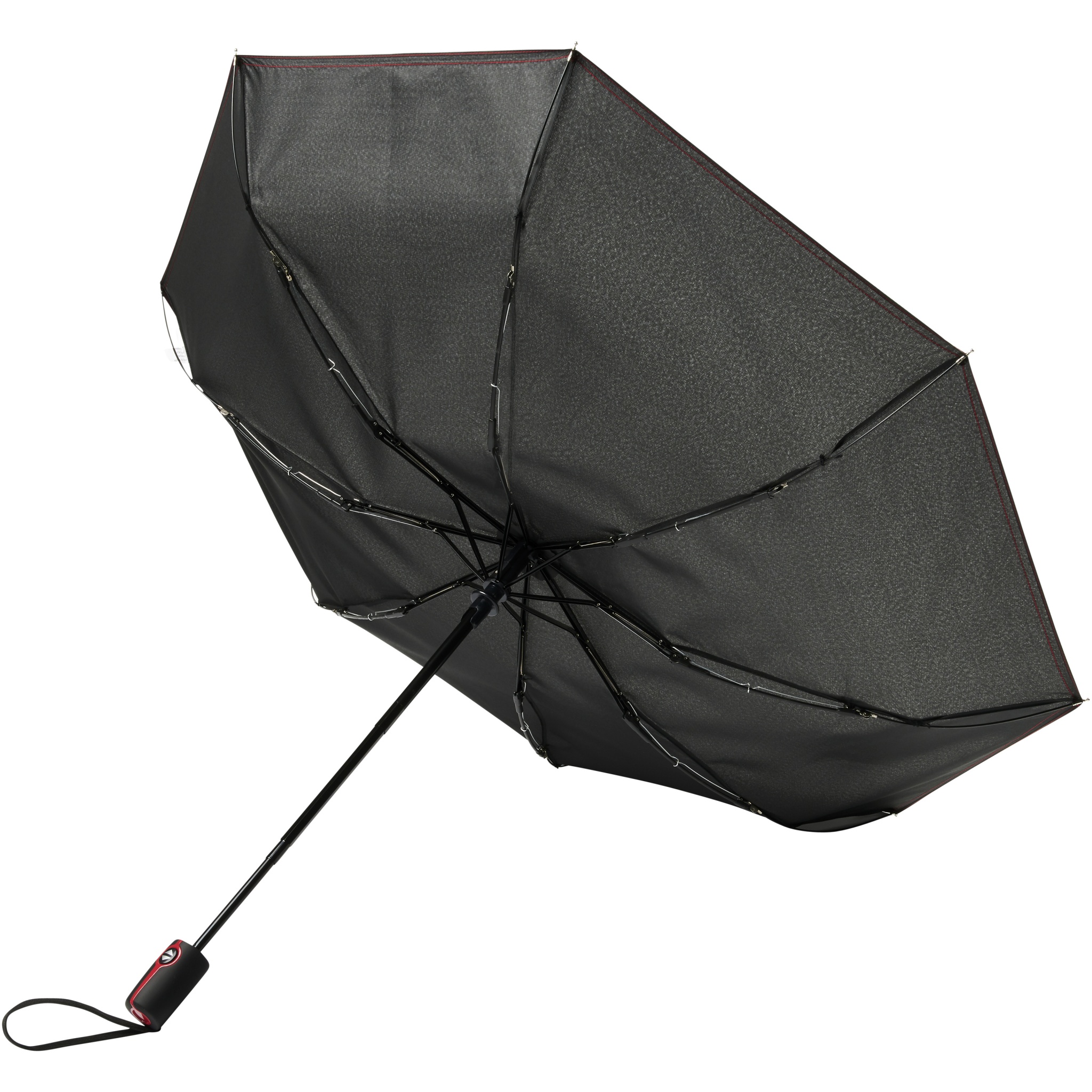 Automatic open and close foldable umbrella with a pongee polyester canopy. Sturdy metal shaft, a high quality frame with fibreglass ribs that offers maximum flexibility in windy conditions. Supplied with a pouch and can easily fit in a handbag or backpack for convenient carrying. Coloured details are available on the soft touch handle and detailed sewing on the canopy and pouch. Large decoration area on each of the panels, as well as the handle.