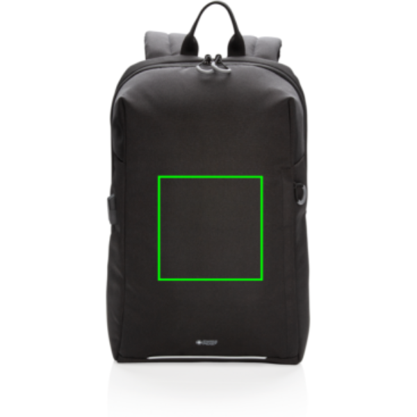 This stylish carry-on laptop backpack is intended for business and leisure trips. It’s designed with a padded 15.6" laptop compartment to protect your device. Including trolley strap and USB A output. Side quick access pocket with RFID protection. Front with reflective safety strip. PVC free. With AWARE™ tracer that validates the genuine use of recycled materials. Each bag has reused 22 PET bottles. 2% of proceeds of each Aware™ product sold will be donated to Water.org.